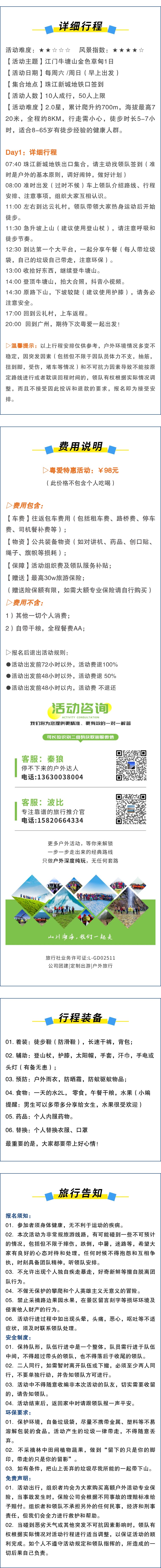 3、如果遇到天气恶劣(下中大雨),会有政府工作人员拦截不给上山(也是为了大家安全,则会改为去江门圭峰山徒步,全程大约11公里,报名则默认接受此条款)