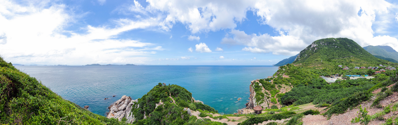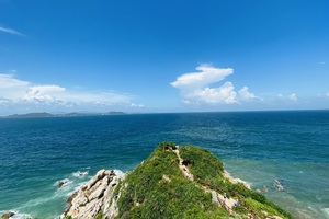 山顶两侧是大海、远处飘浮的小岛、天空的白云