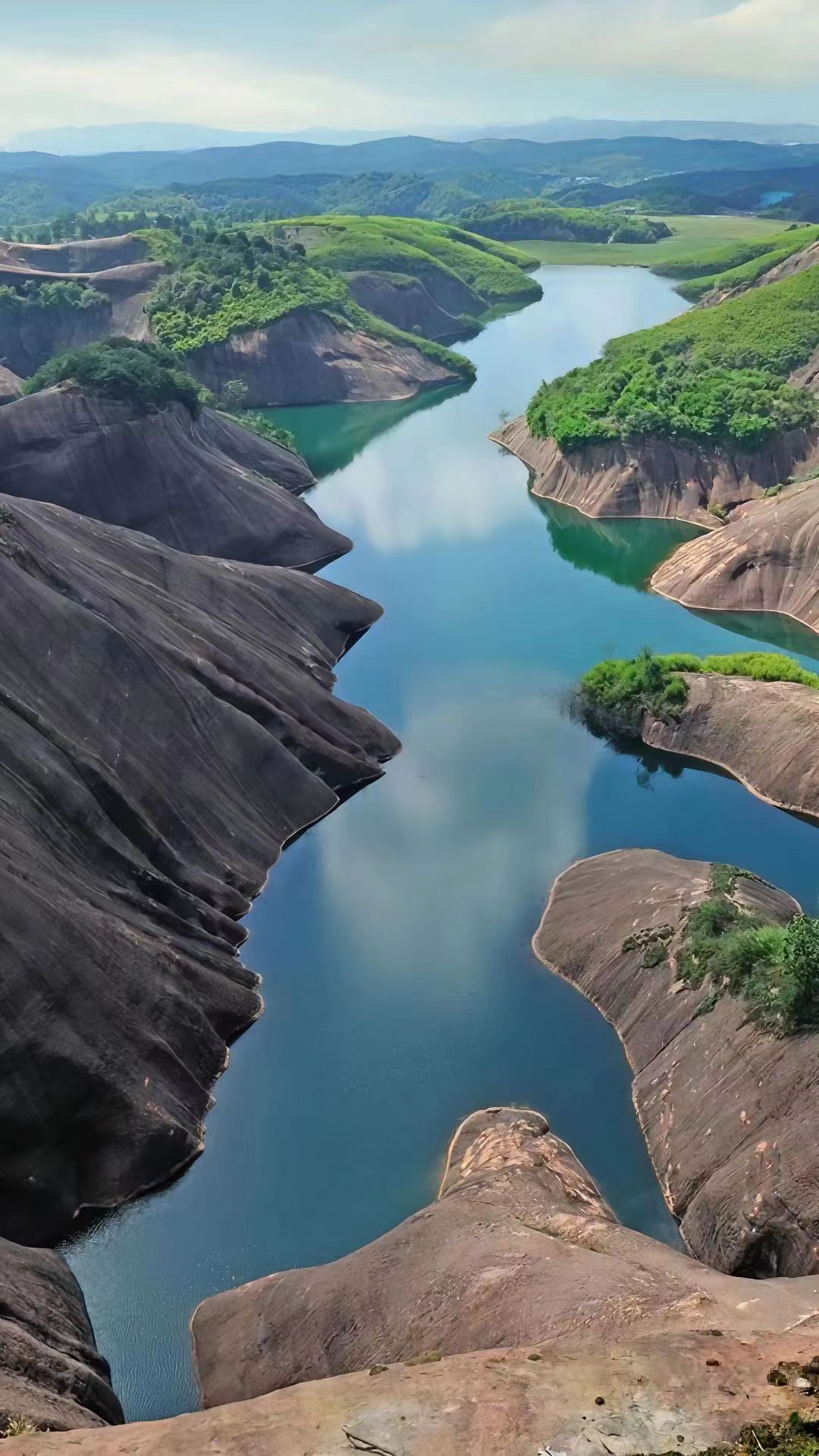 远山如黛,青山碧流,烟波浩渺,碧波如镜