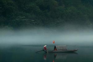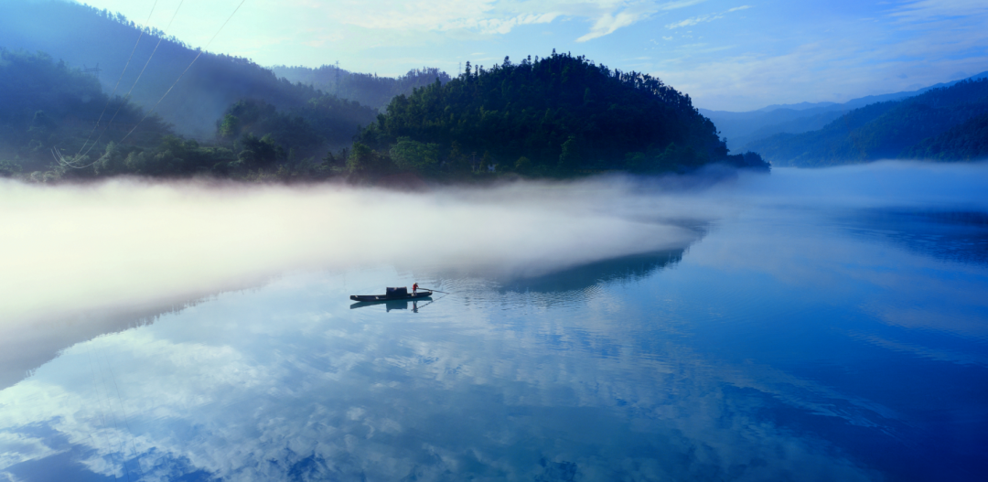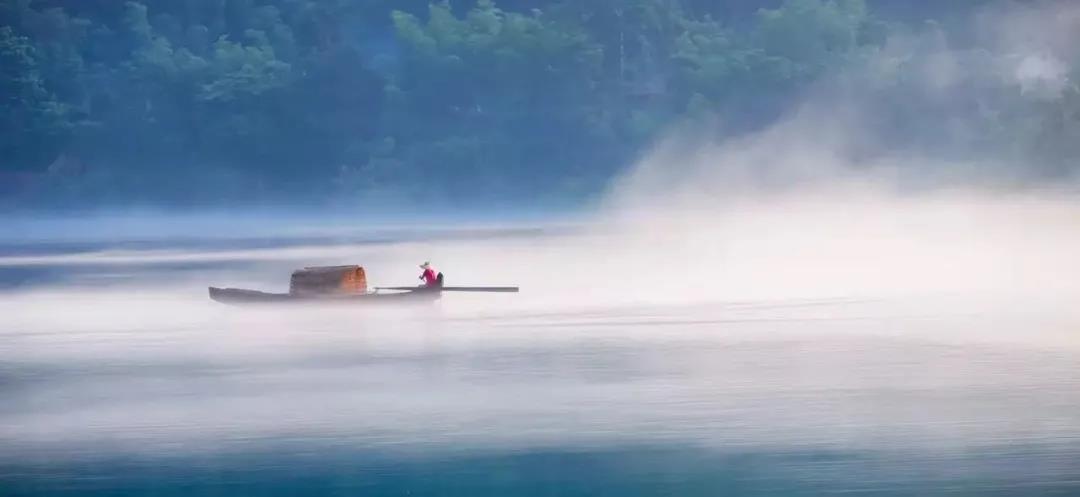 渔翁乘一叶扁舟,自雾中悠悠驶来