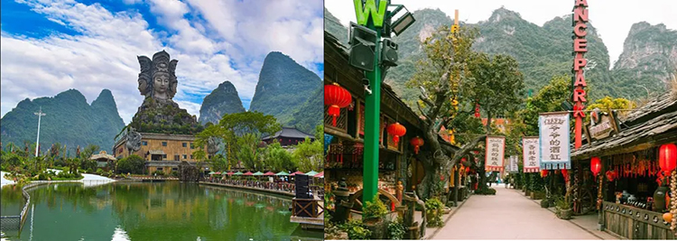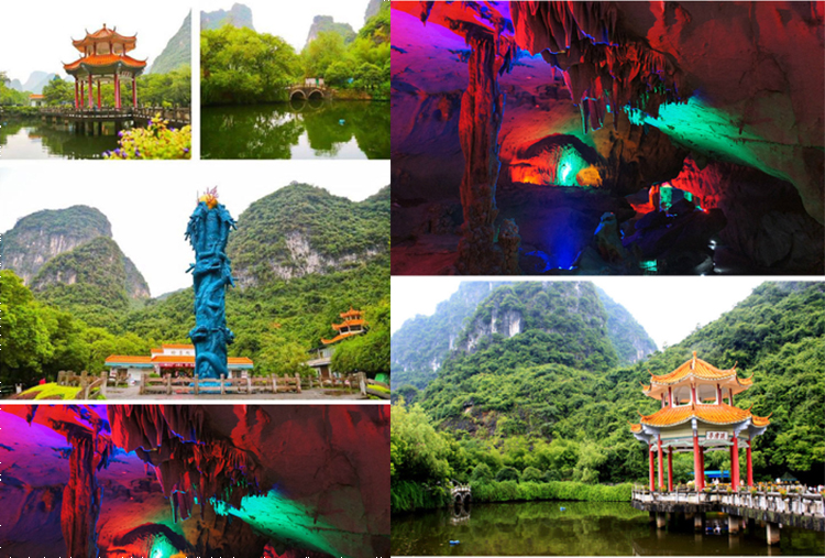 景区内依托周围的山水,按照当地少数民族风格建筑,亭、台、楼、阁,四周绿数环绕其中,更为一绝的是神秘的地下河配以广西最具特色的“刘三姐对歌”。