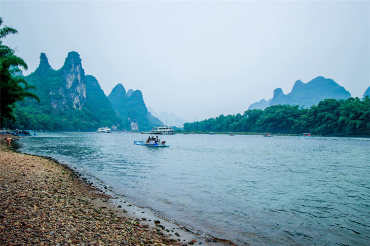 乘舟泛游漓江中,可观奇峰倒影、碧水青山、古朴的田园人家。