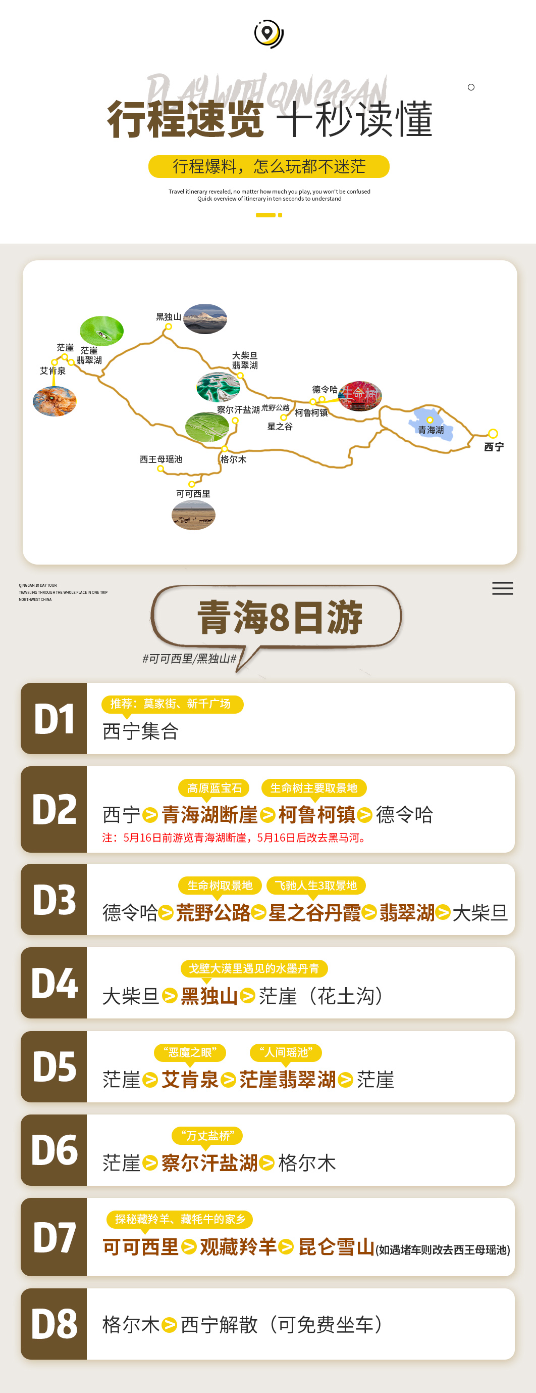 注:格尔木-索南达杰自然保护站路段正在修缮,有部分路段颠簸,如遇临时不可通行,我们改为前往西王母瑶池游览。
