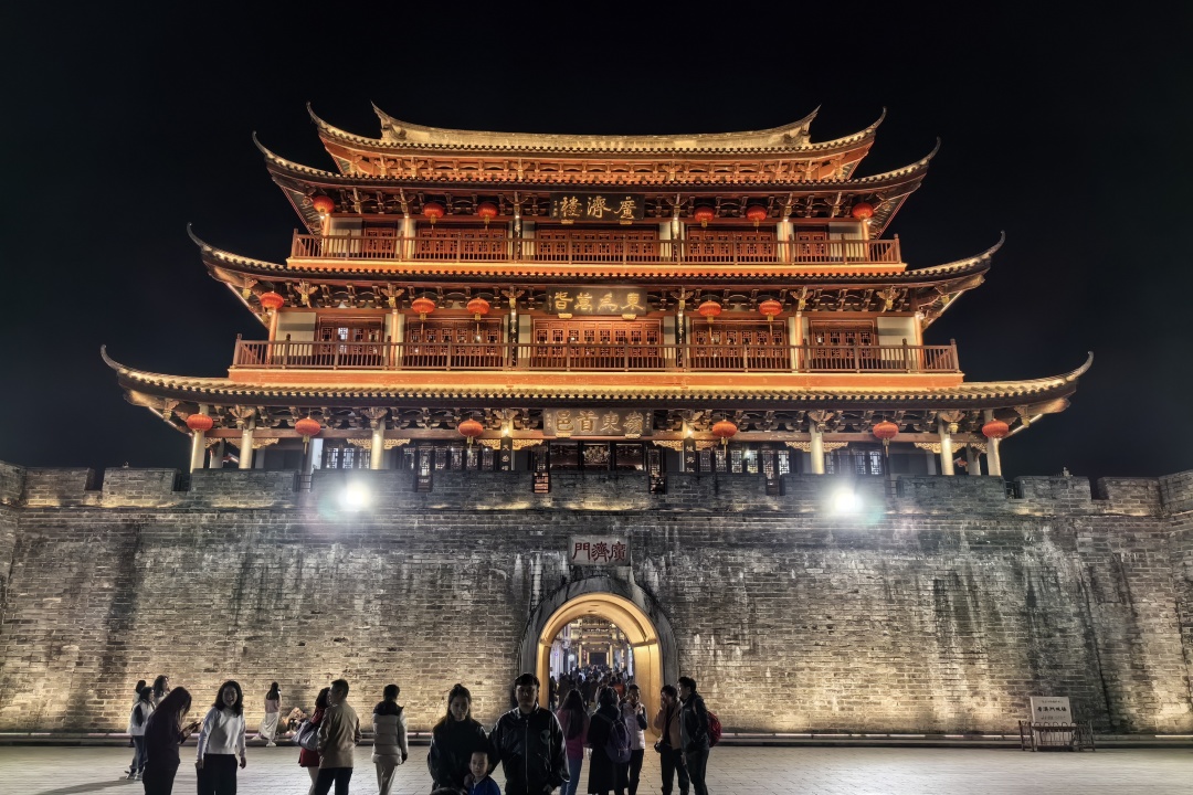 广济门城楼原称“广济楼”,也称“韩江楼”,民间俗称“东门楼”,列潮州城七城楼之首,襟江控岳,护邑镇桥,为名城标志之一。 广济门城楼是一座宫殿式三层歇山顶阁楼楼置于高大厚实的台基上,拱门中开,面阔七间,进深五间,前后面为木石柱相衔接支撑,并跨出城墙外,成为骑楼。