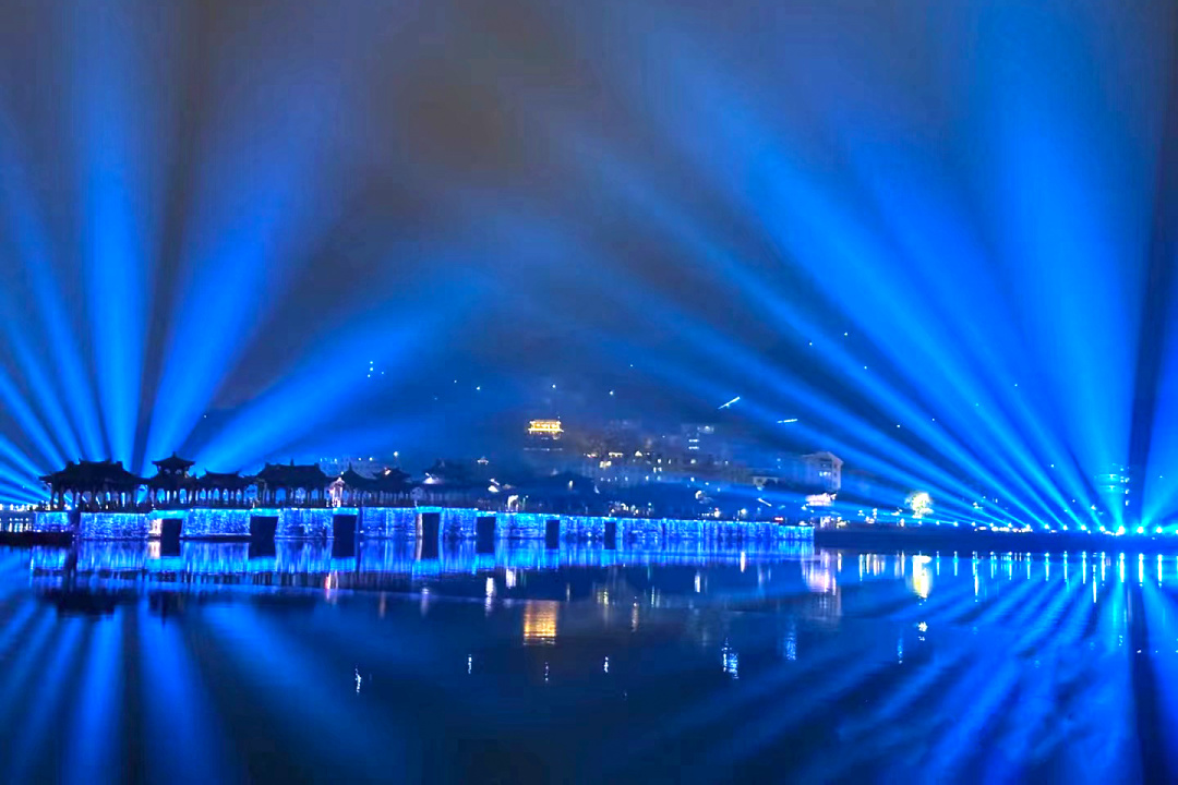 潮州古城灯光秀,韩山映射水波纹、波光粼粼,自然光色与古城风韵结合。诗的意境、画的取景,一江两岸即在画中,又在诗中,俨然有一股水墨乡愁丹青韵味。古城灯光秀是与气势磅礴的潮州音乐紧密结合,绝佳视觉、听觉享受!