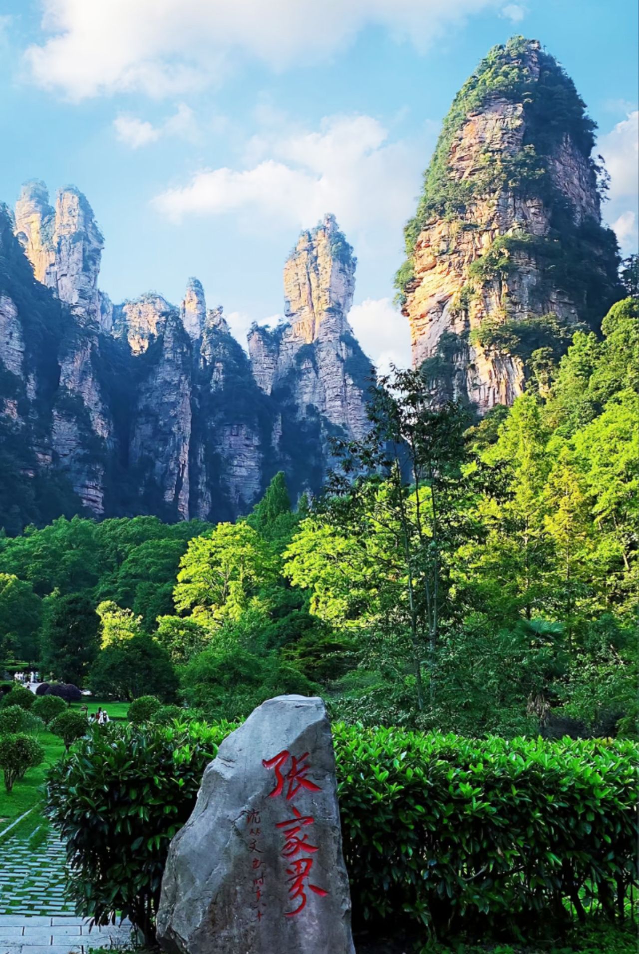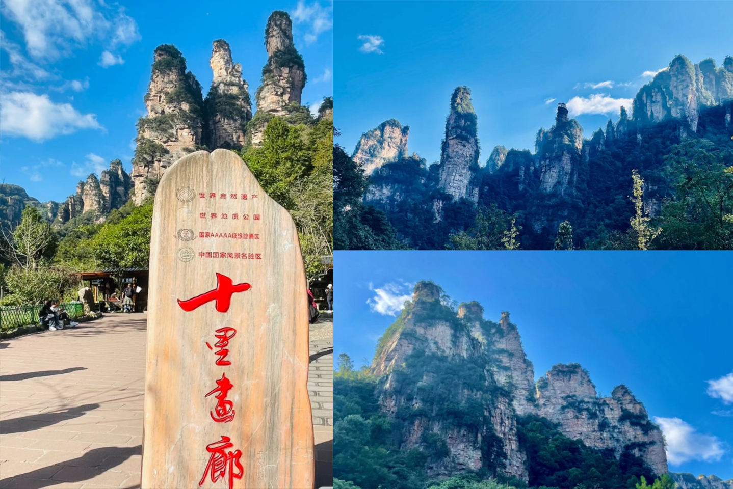 14:00 左右到达水绕四门,可以自行坐车(免费)去百龙天梯,气势恢宏,最高的户外电梯(排队时间约两三个小时,需要自费乘坐上和下),也可以坐车(免费)去十里画廊徒步(来回3km),十里画廊景区在这条长达十余里的山谷两侧,有着丰富的自然景观,人行其间如在画中。沟旁黛峰屏列,山上的岩石形成了200来尊似人似物、似鸟似兽的石景造型,其中“孔雀开屏”、“采药老人”、“寿星迎宾”、“猛虎啸天”等最为著名。
