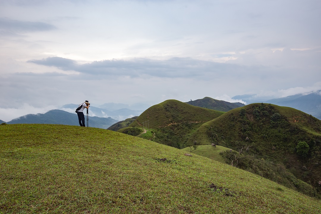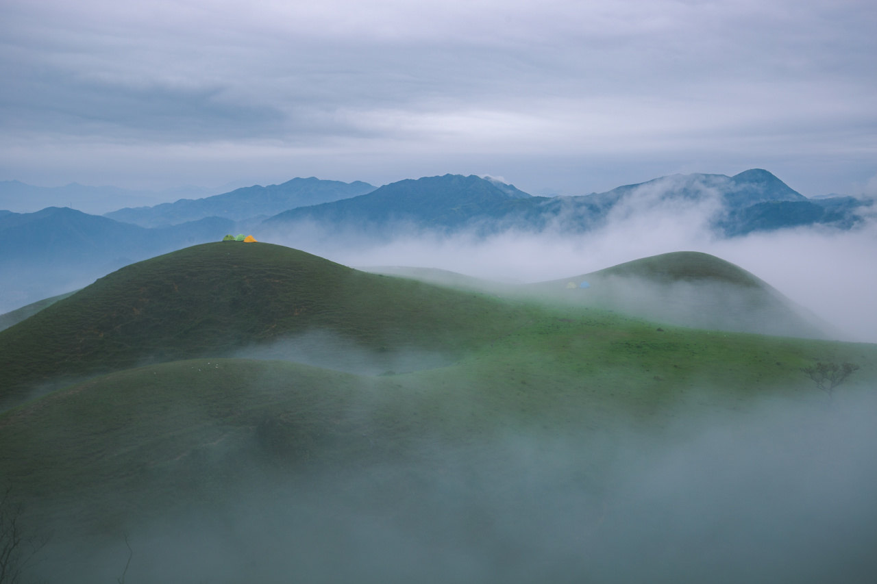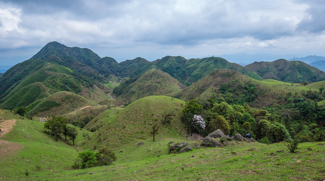 鸡笼顶的风光很独特,灌木林与草地泾渭分明,山脊全部长着厚厚硬实实的一层草皮,最高的草不超过20公分。而山坳全部长着苍翠的灌木林。