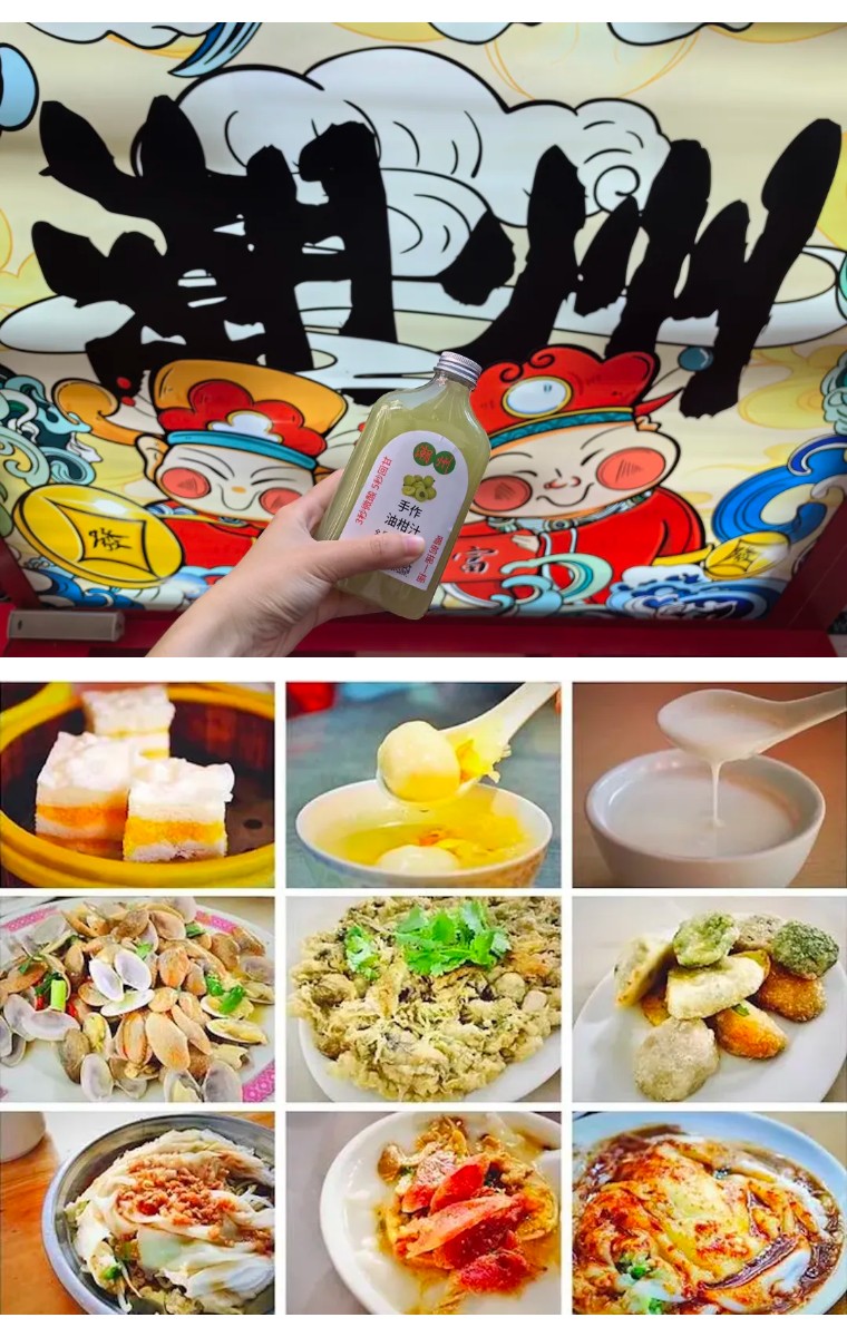 潮汕牛肉火锅、手打牛肉丸、煎粿、蚝烙、咸水粽、糖葱薄饼、红桃粿、草粿、灌粿条面、甘草水果、油柑汁、凤凰浮豆干、春饼、溪口卤鹅、肉脯等等,各种美食,简直让人停不下来!