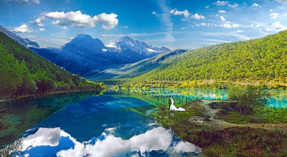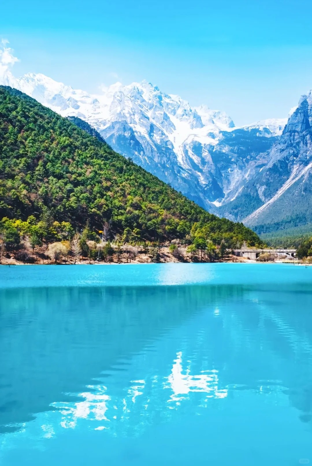 远看就像一轮蓝色的月亮镶嵌在玉龙雪山脚下,有个“小九寨沟”之称