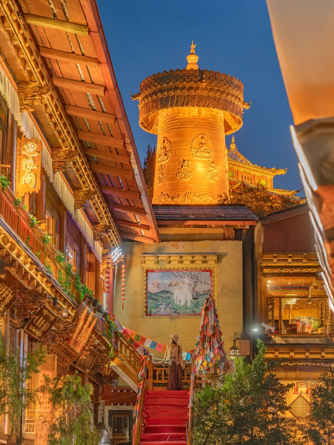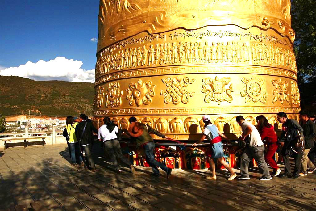 游览“月光古城”【独克宗古城】,大火之后的独克宗古城,较大的转经筒完好无损,感谢上天的神助,它是上天送给您的礼物,请您转动经筒,为远方的亲人、朋友送去祝福,为香格里拉古城祈福。