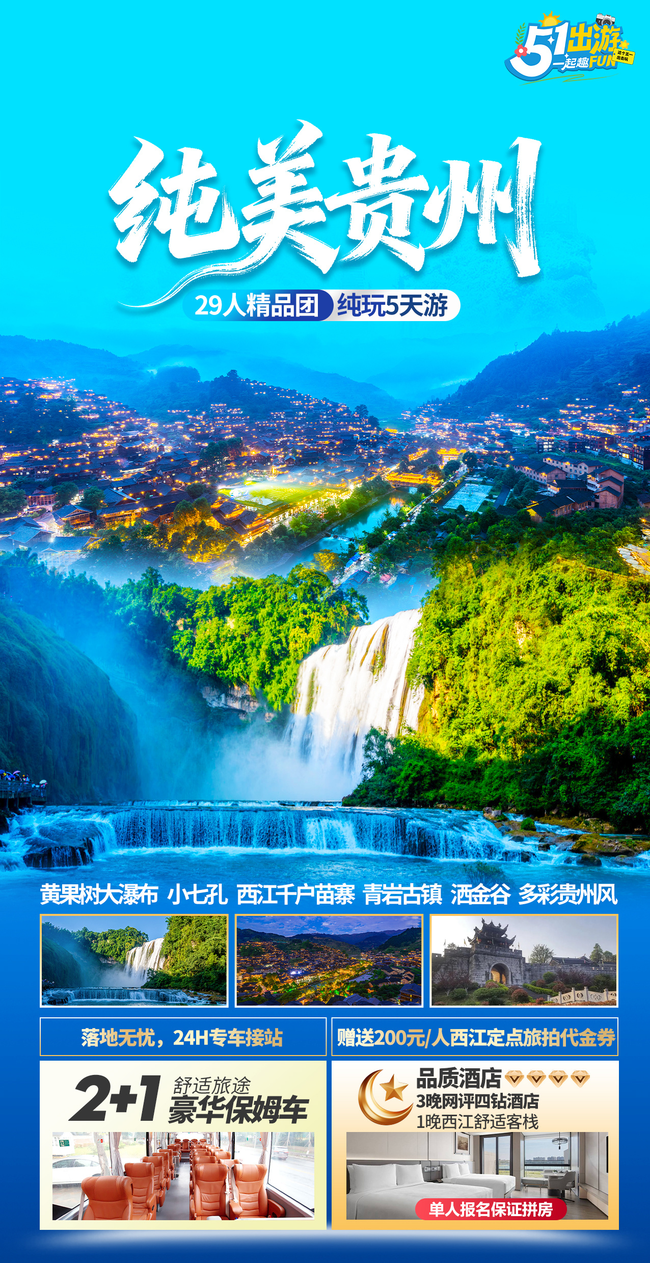2. 不含景区必消小交通:黄果树大瀑布观光车50元/人+保险10元/人、小七孔观光车40元/人+保险10元/人、西江4程观光车20元/人+保险10元/人,青岩观光车25元/人,电瓶车+高空栈道+玻璃栈道+木晃桥50元/人费用需自理。总合计:215元