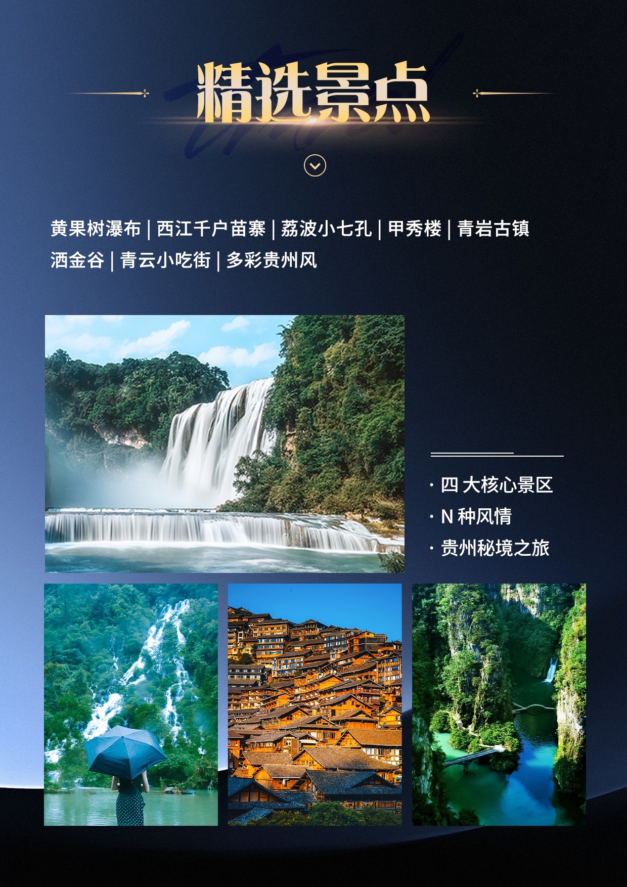 10. 贵州地处云贵高原地区,山路较多,请穿轻便、柔软休闲鞋子;贵州素有天无三日晴之说,天气多雨,请自备雨伞;少数民族寄居地,请遵循当地风俗。