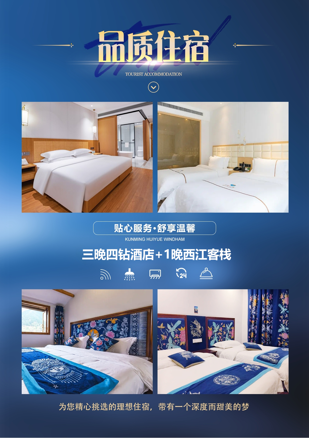 2. 住宿:三晚网评四钻+1晚西江精品客栈,如需单人用一间房请自行另补单房差或者接受安排拼房。