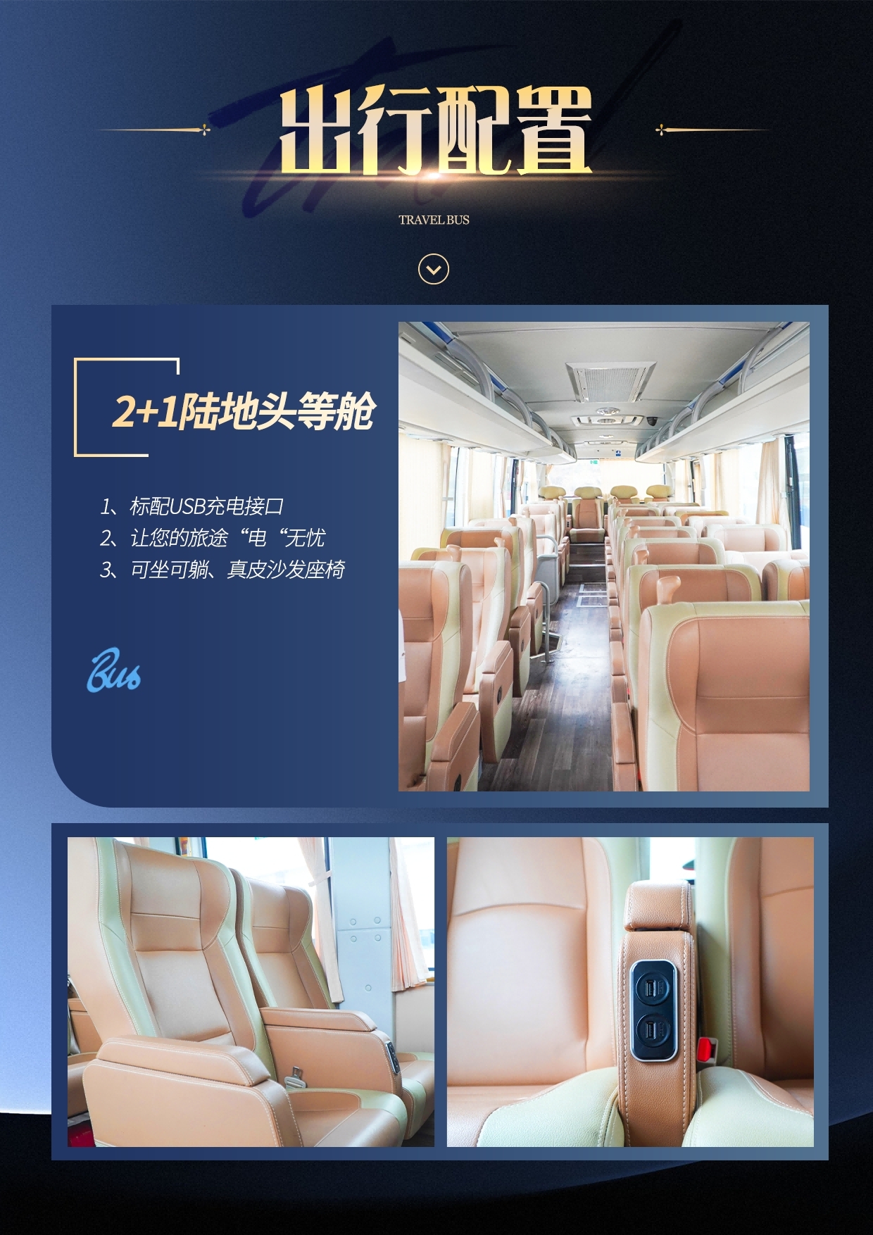 2+1陆地头等舱全新豪华旅游巴士(根据团队人数情况用车,12人以下用9座或15座豪华旅游商务车)