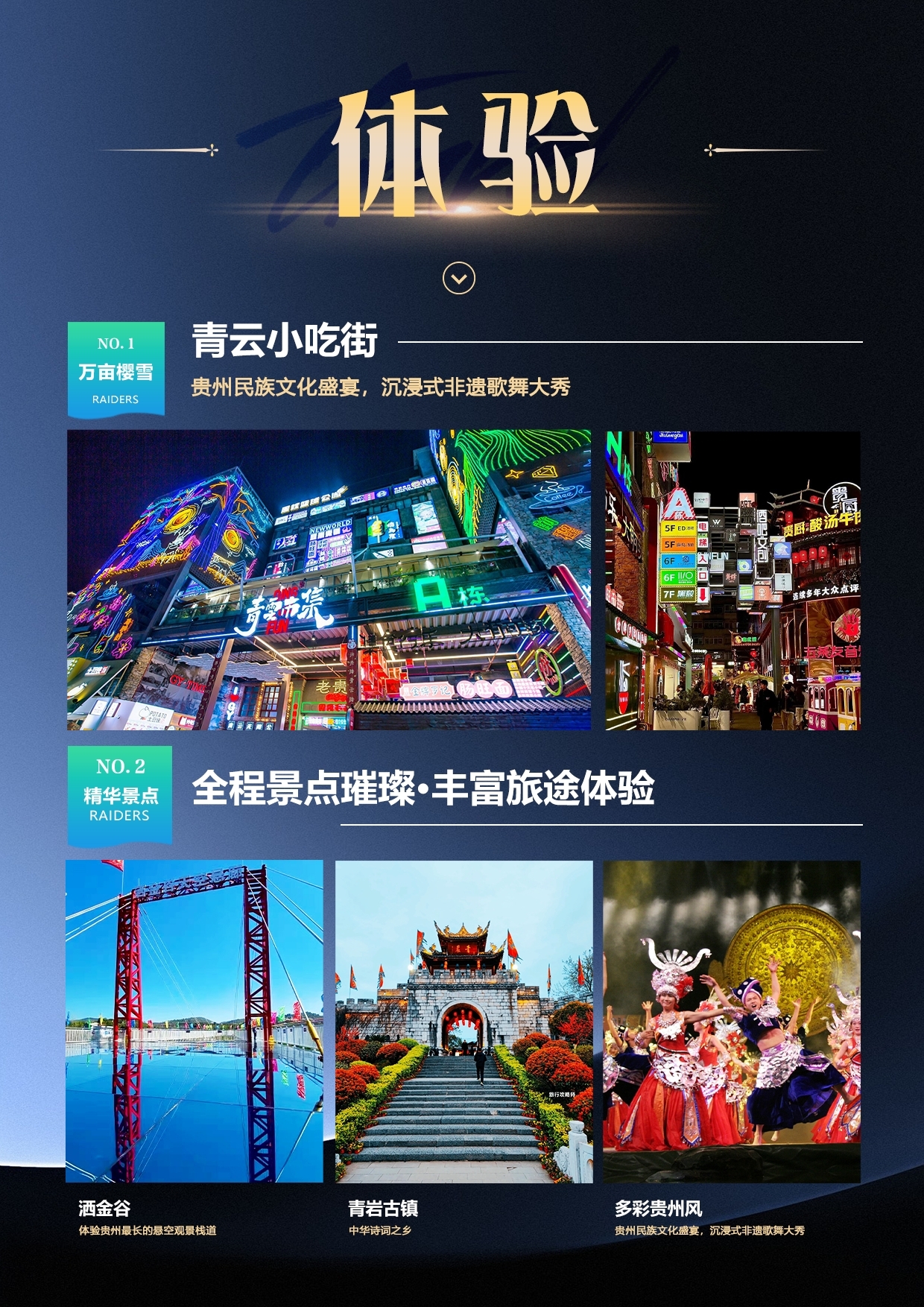 晚餐锁定贵阳夜游顶流打卡地【青云小吃街】,在这里解锁 “老贵阳 新调调” 的沉浸式体验,让味蕾与感官双重沉醉。漫步街区,美食摊位的香气与文创店铺的手作质感交织,非遗蜡染的靛蓝、手工银饰的光泽随处可见,街头音乐与摊主吆喝声勾勒出浓郁市井烟火。既能在非遗体验区亲手尝试苗族刺绣,也能在潮流角落打卡赛博朋克风灯牌,白天逛文创、夜晚品美食,24 小时不打烊的热闹氛围贯彻始终。