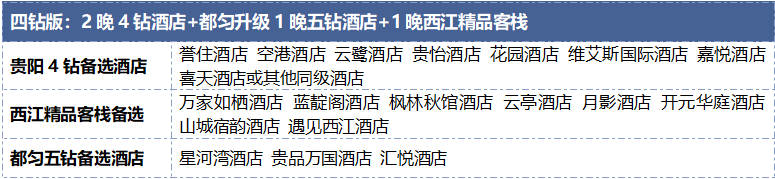 3. 贵州酒店标准偏低,请旅游者提前做好心理准备。如遇旺季酒店资源紧张或政府临时征用等特殊情况,我社有权调整为同等级标准酒店。