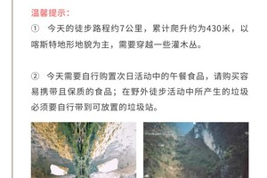 2.本活动因涉及户外徒步、长途坐车、刺激项目等情况,报名人需确保身体健康适宜旅游,有高血压、心脑血管疾病、传染性疾病、呼吸系统疾病、精神病、严重贫血病、大中型手术的恢复期病患者、行动不便者、孕妇等情况游客谢绝参加。代他人报名者,须准确了解被报名人的健康情况是否满足本线路要求。