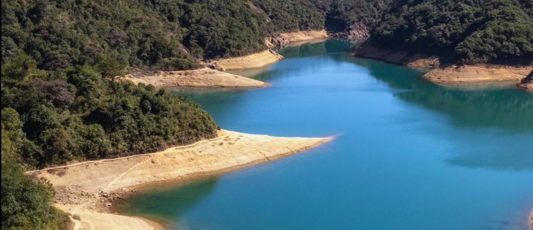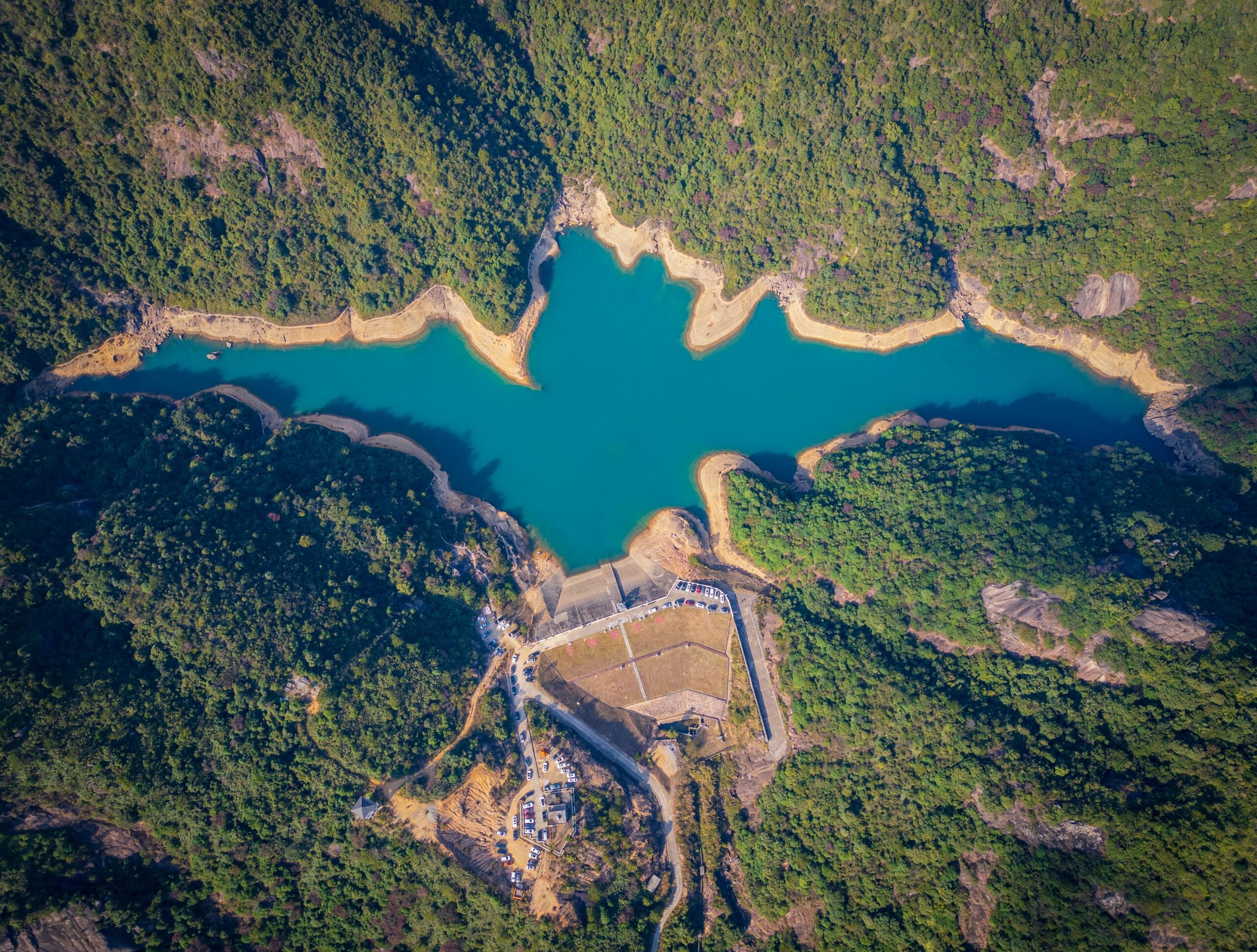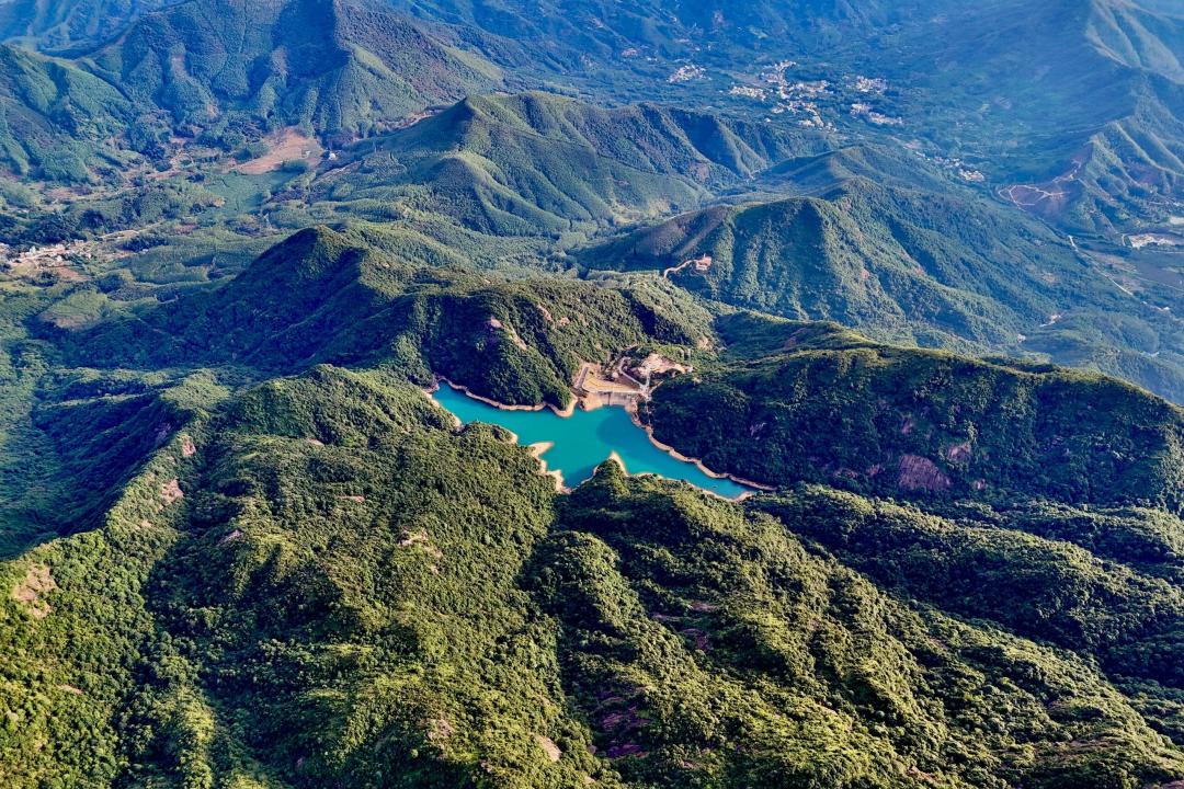 登临奇峰巨石,俯瞰群山与碧绿水库。