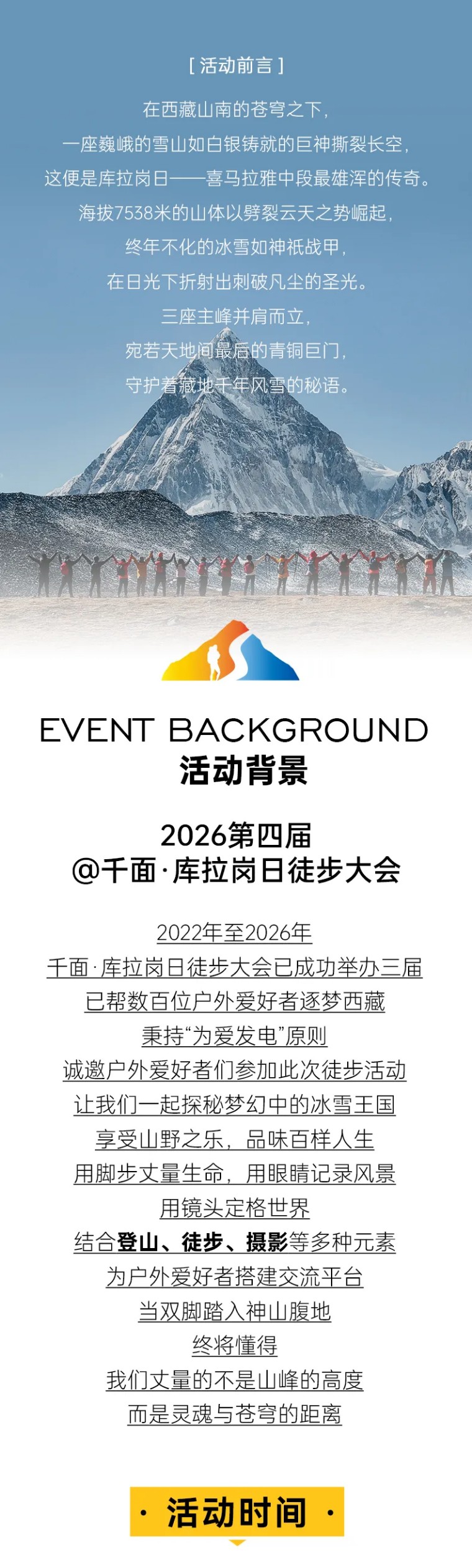 1.全程徒步约18公里,徒步平均海拔为4700米左右,徒步最高海拔为折公措垭口5000米左右,坐车最高海拔为蒙达拉山口5363米,住宿最高海拔为洛扎4000米左右。2.一月属于冬季,天气稳定,偶尔下雪,是看日照金山和星空最佳的时候,同时沿途的湖泊会结冰,也是看蓝冰的时候。