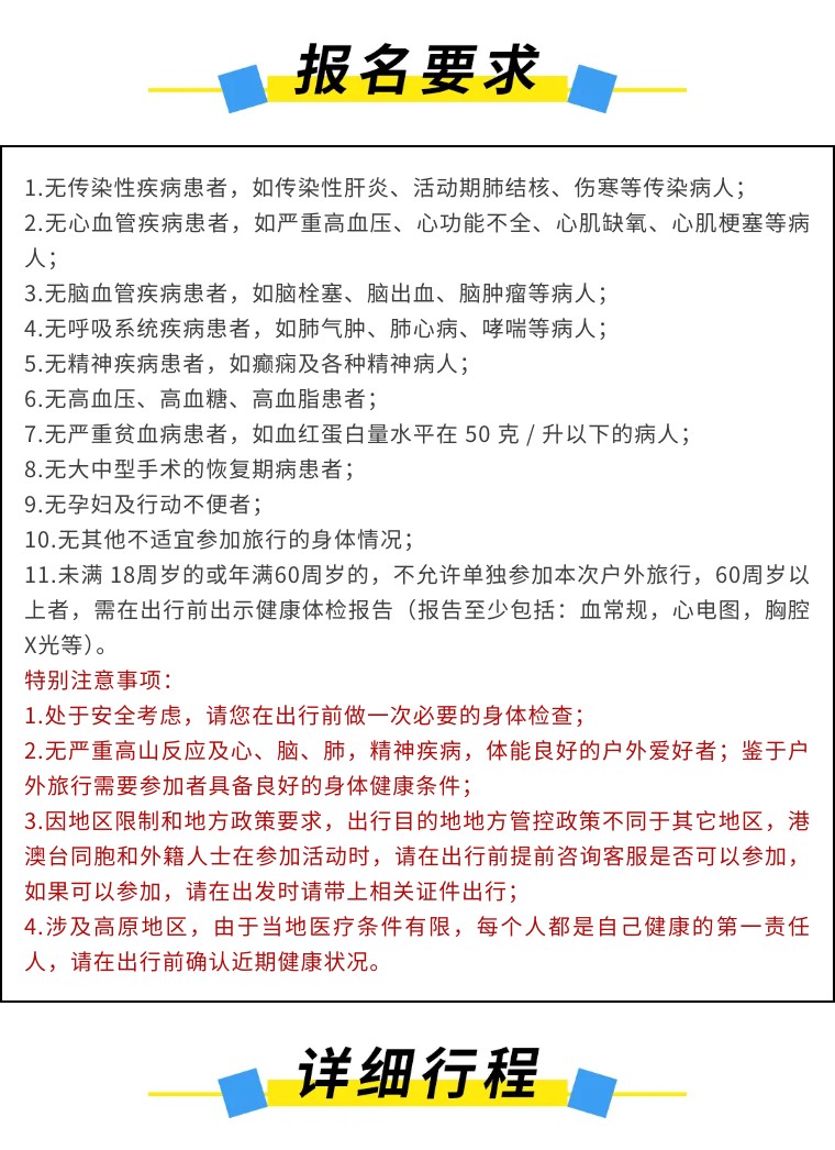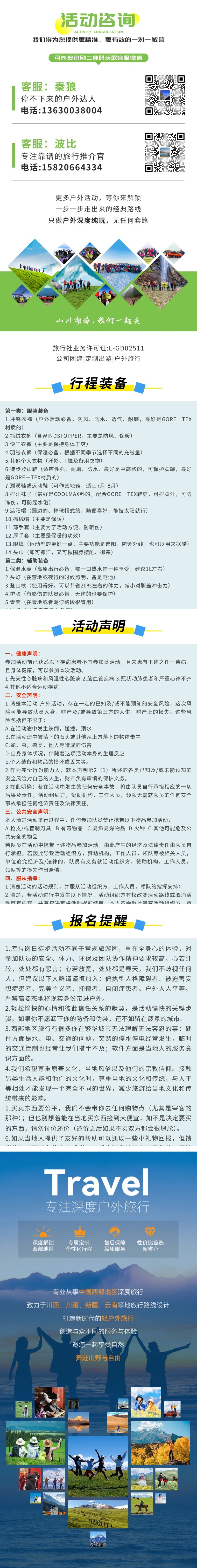 6、其他:旅行中的个人消费(部分早餐、个人其他消费等)全程不含午餐、晚餐,提前准备3-4天徒步中午的路餐,建议准备易携带、热量较高的食物:巧克力、士力架、面包、坚果、牛肉干、水果等。