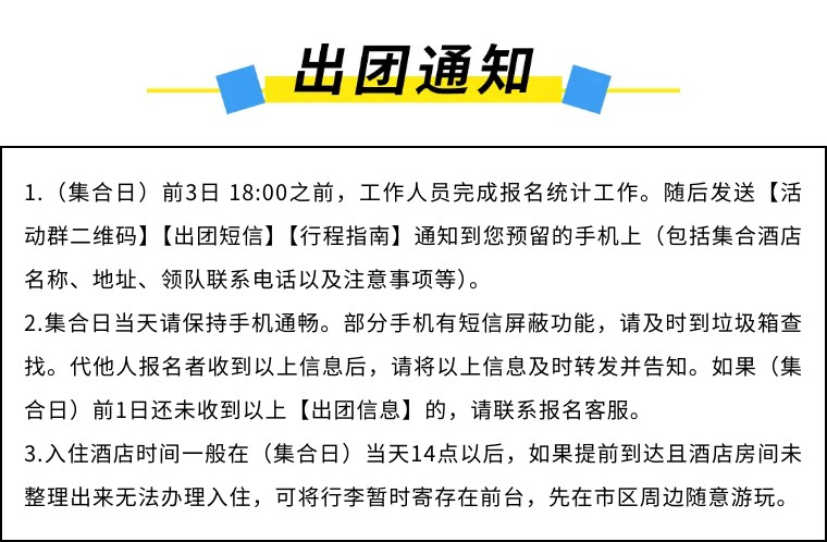 3、单房差:单独参加我们散客拼团活动,默认与其他同性拼房;如无法拼房也无须另补差价。