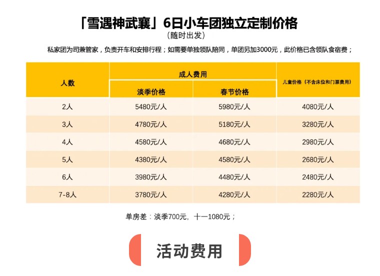 2.单人房差费用:住宿费用是按照2人入住1个标准间安排,若有单人报名,不愿拼房的情况,将会产生单人房差情况。