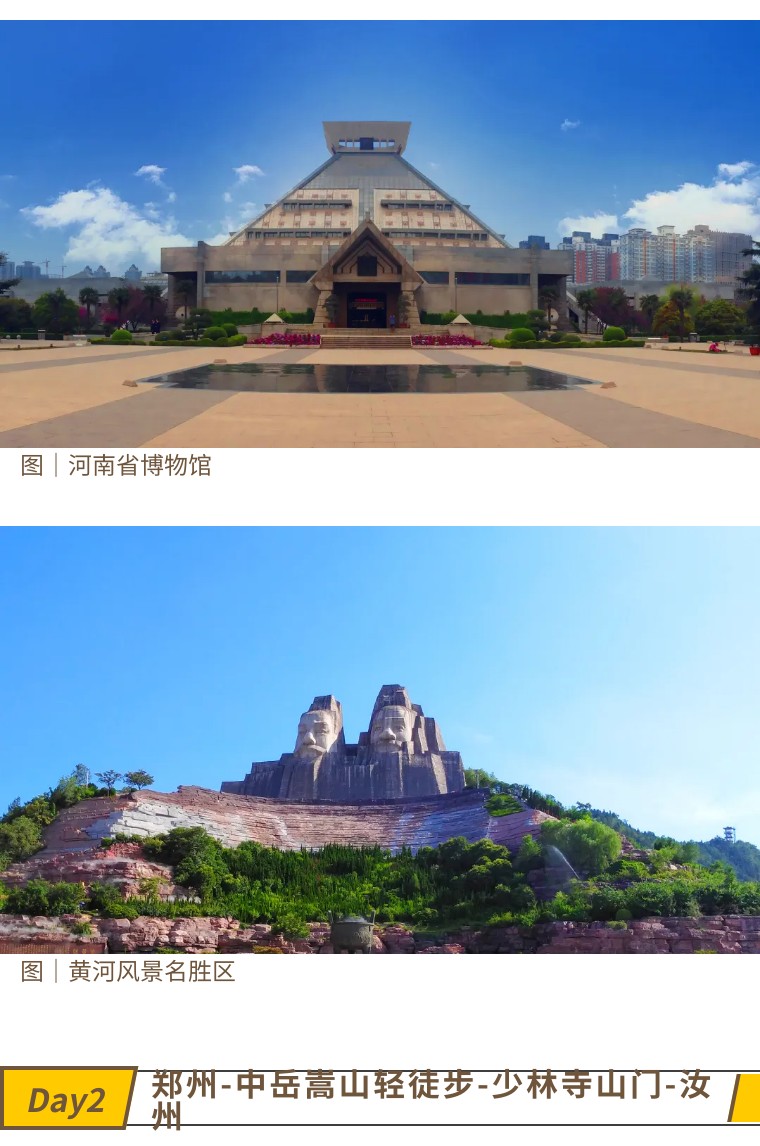 全国各地的小伙伴们到达郑州集合。到的早的伙伴可以到【河南省博物院】,去看看人类文明的起源发展,也可以到【黄河风景名胜区】,去感受母亲河的大河文化……一定记要品尝河南特色美食哦,河南烩面、道口烧鸡、胡辣汤……
