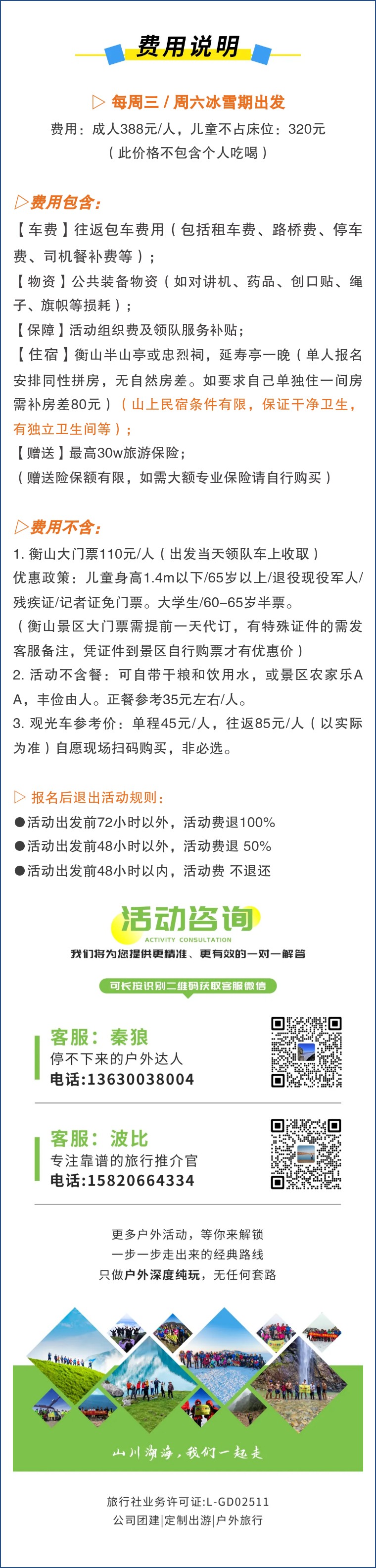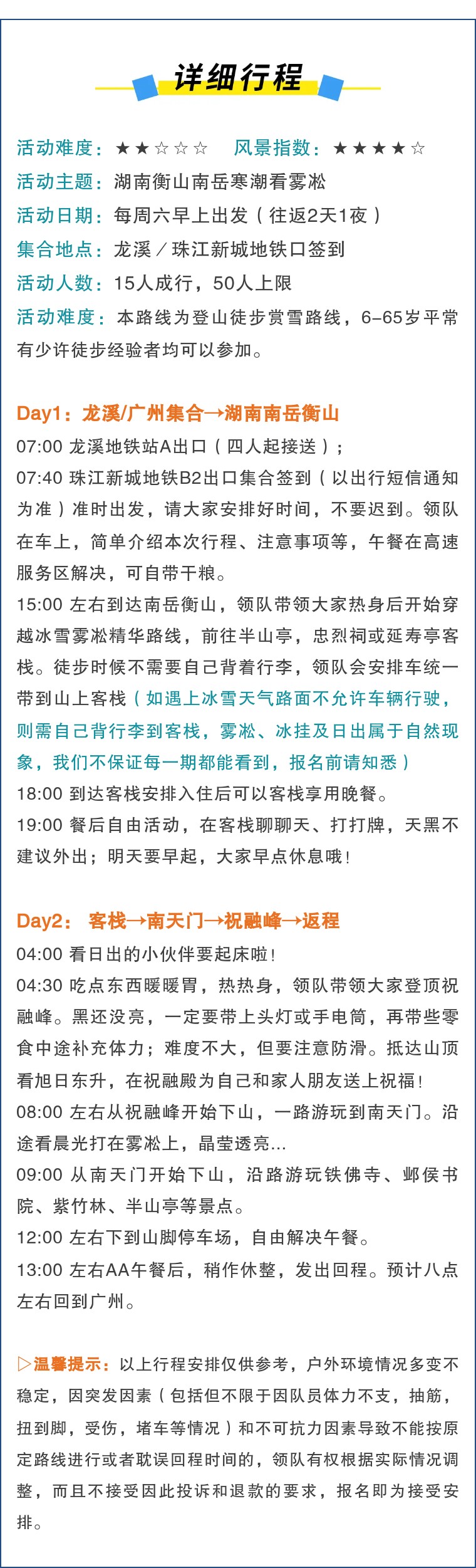 重要提示:雾凇雪景属于突然性的自然奇观,可遇不可求,报名前请确定知悉此提醒!(一般衡山当地天气预报显示5度左右,山上极大概率形成雾凇雪景奇观)