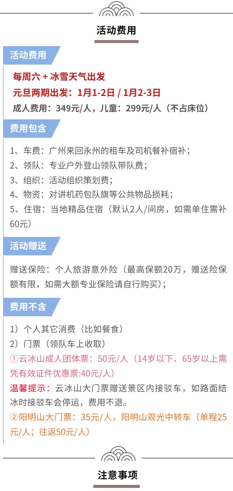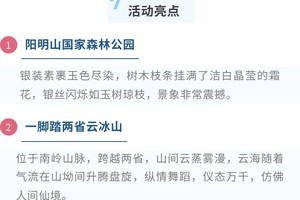 3、云冰山和阳明山的雪景、雾凇此为季节气候性产物特定条件下才能看到,不能保证百分百能看到,请以实际为准,如遇不理想,不另做赔偿。