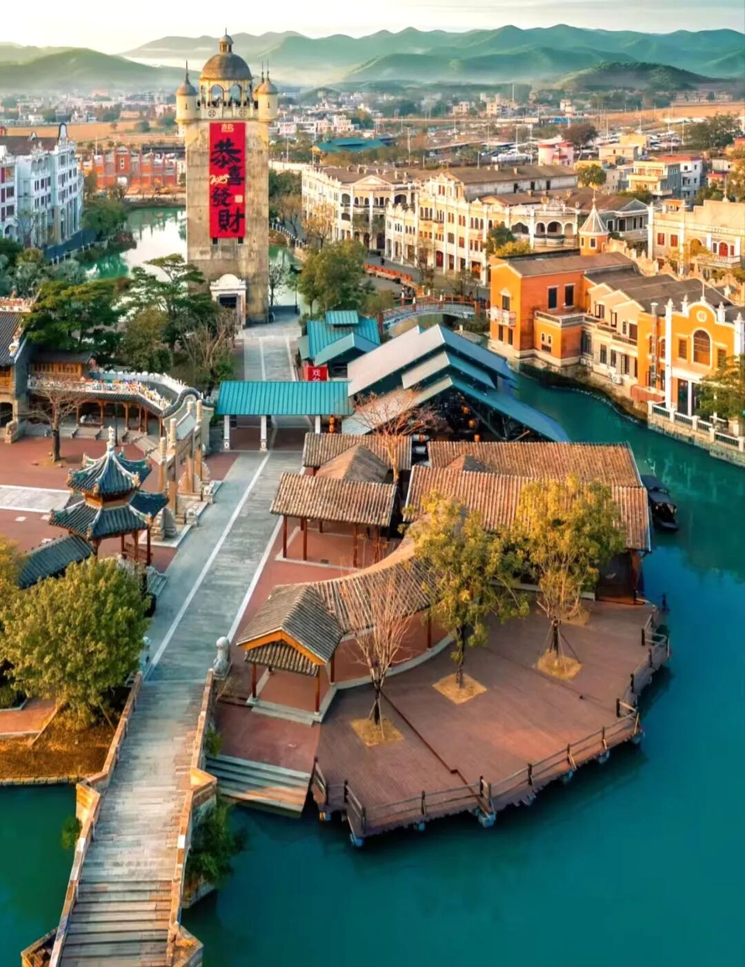 10:30到达【广东赤坎古镇侨乡国际旅游度假区】,以历史骑楼街区作为核心,打造集观光游览、休闲度假、商务会展、文化创意、和古镇体验功能为一体的综合休闲旅游度假区、世界级旅游目的地。度假区总规划面积约 120 万平方米,坚持在保护的基础上进行活化利用,以历史场景为脉络,形成古镇集华侨历史文化、商业综合、舒适休闲度假和独特的岭南骑楼建筑景观的聚集带,一河两岸独特的中西合璧建筑魅力,融入古镇繁荣的市井生活方式,为游客带来穿越时空的超凡体验。