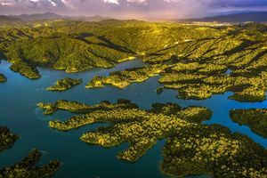 万绿湖为华南第一大湖,是粤港千万人的重要饮用水源地。360多个绿色岛屿星罗棋布,从高空俯瞰是一片被绿色浸染的山水画卷,负离子含量高常年高达50000个/cm³,是难得的“城市绿肺”。