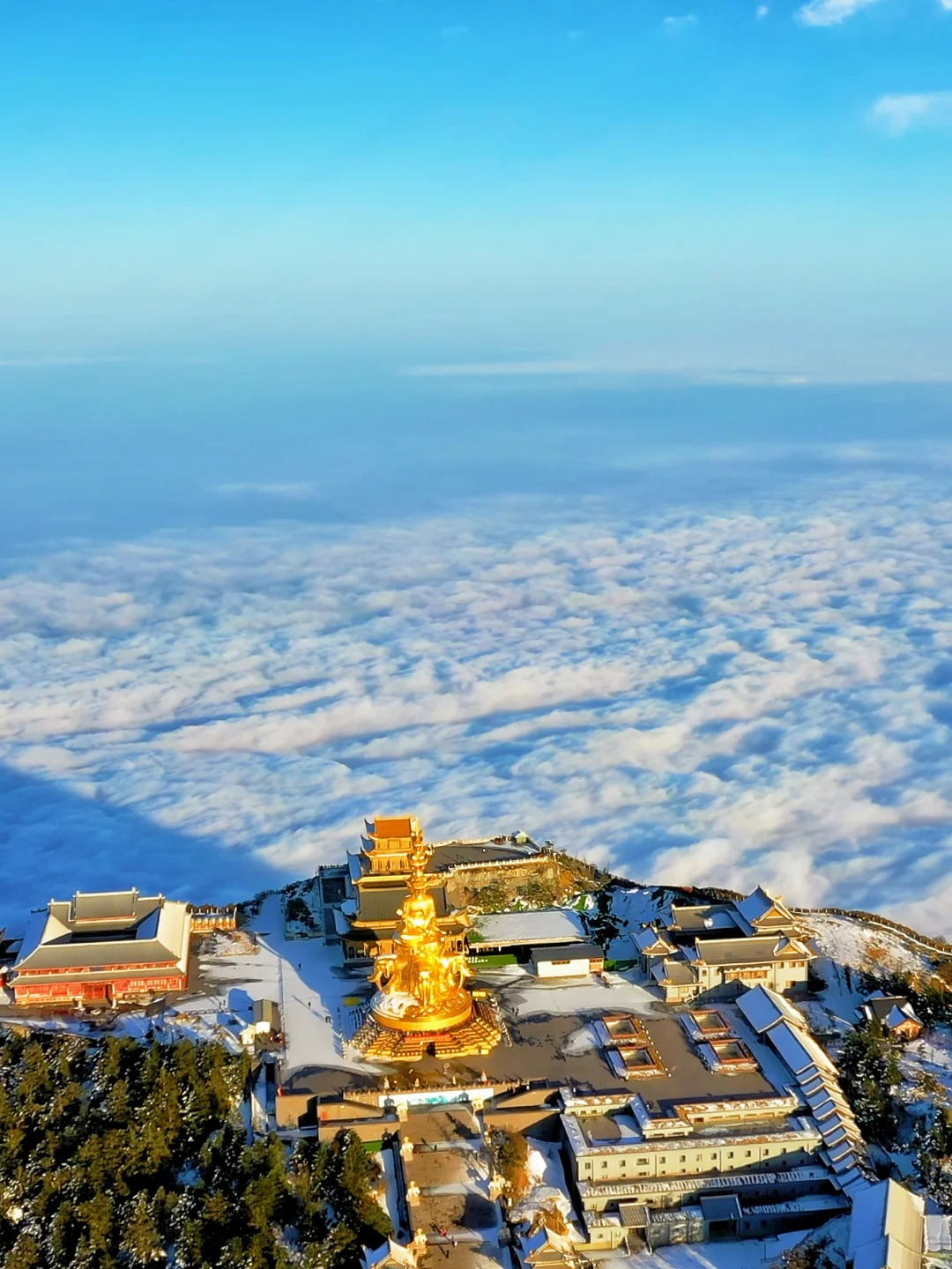 云海:云雾翻腾如沧海,金顶如仙岛漂浮其间