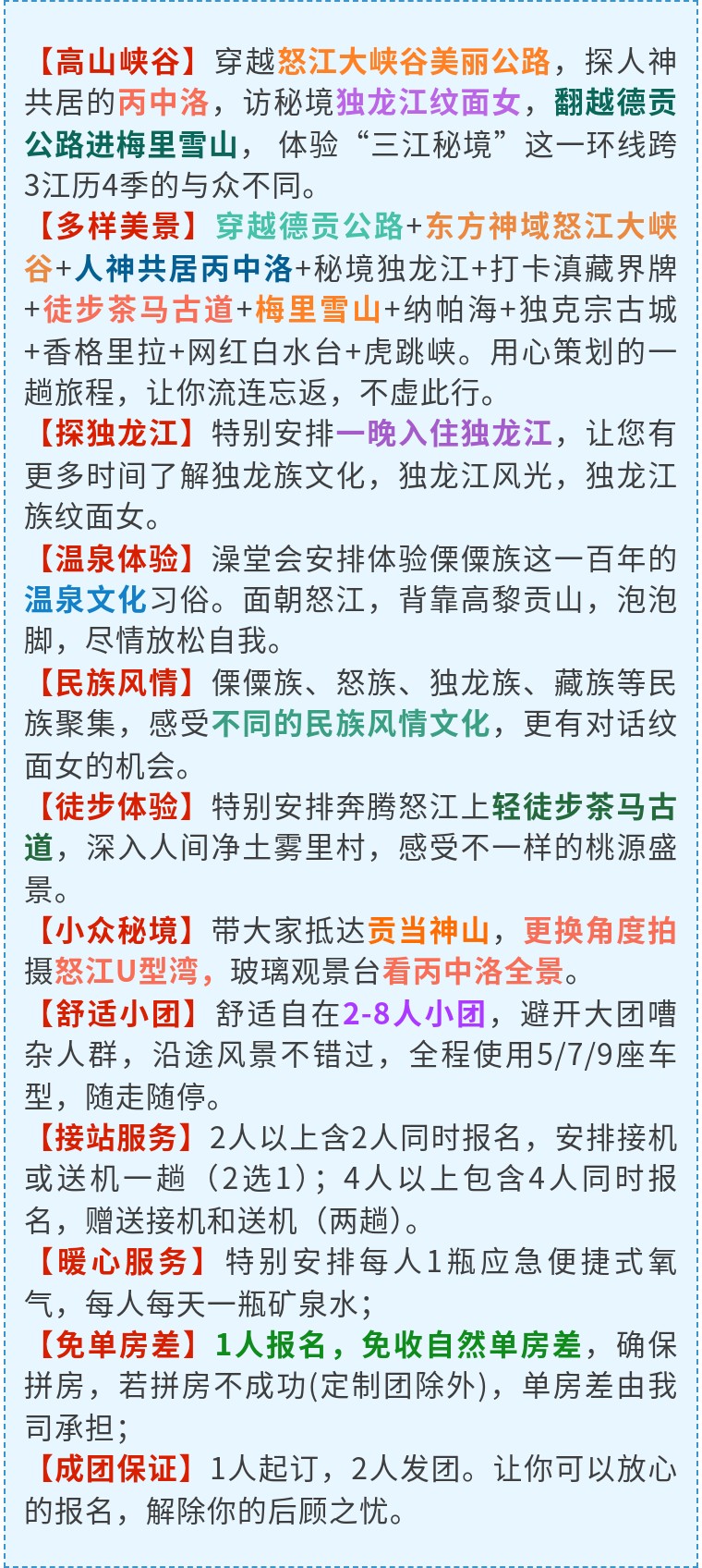 2.如德贡公路因天气或者政策性原因不能进入,则行程更改为:D5:丙中洛-六库,住:六库D6:六库-虎跳峡,住:虎跳峡D7:虎跳峡-中虎跳观景台-哈巴雪山观景台-白水台-丽江解散