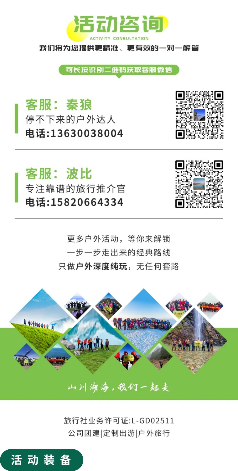 (1)服装:每年11-次年5月,请着冬秋装,衣服建议三件套是最佳(保暖排汗内衣+抓绒衣+冲锋衣+速干衣裤,也可羽绒服代替);6-10月夏秋季,请着内衣+轻薄外套;