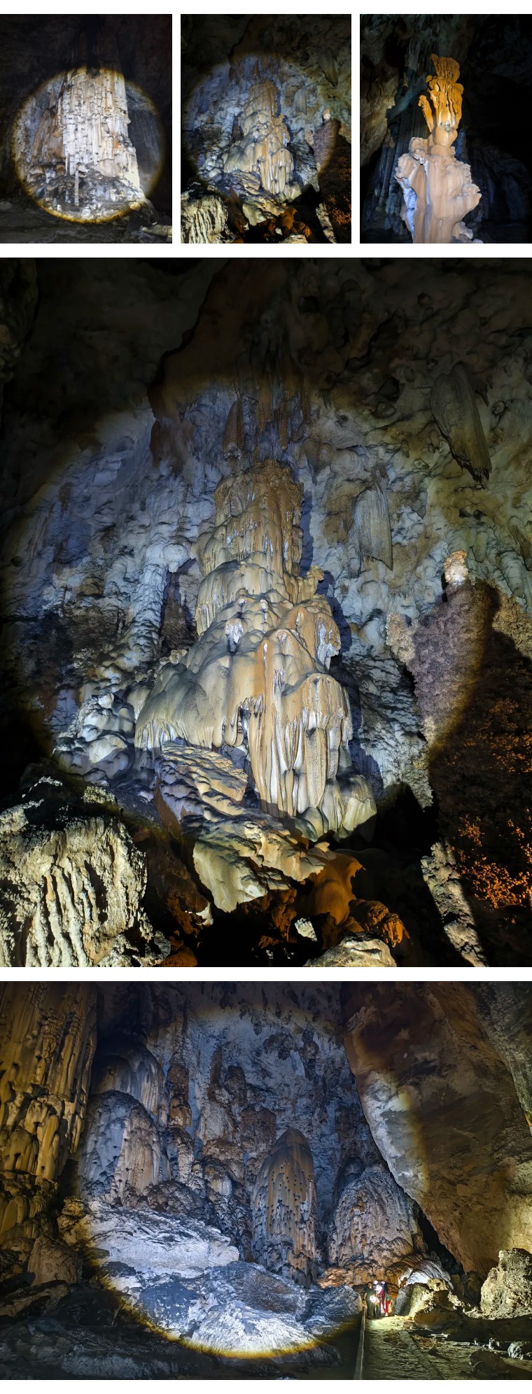 各种流石坝,美不胜收。溶洞里到处都石英砂晶石,用头灯一照,星光点点,如满天繁星