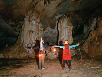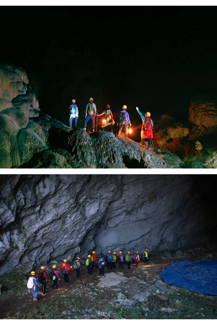 07:30徒步地心之旅。5小时的熊家俩洞连穿徒步穿越,线路很成熟,地心之旅徒步大会精华段就这里。这个季节,最合适早起登山,先进行一小段的登山,今天的午餐是路餐,只能是在洞里吃,带上温水,还有干粮,一起探索神奇的天坑溶洞世界吧