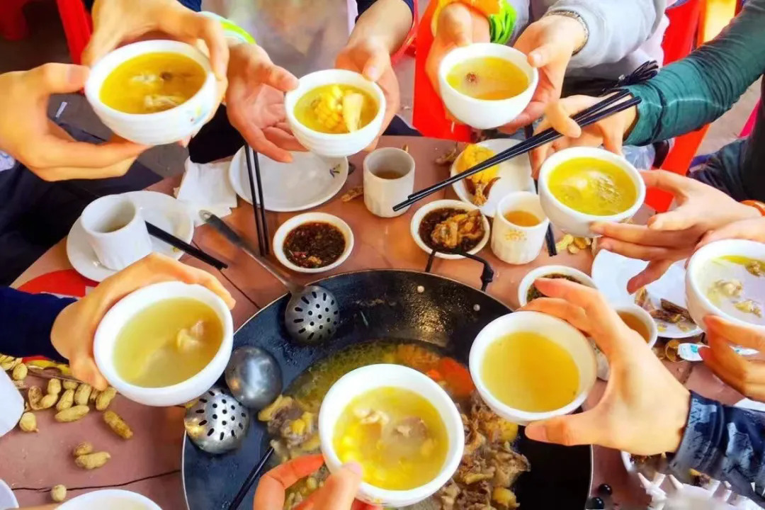 2)自带干粮,全程餐费AA(柴火茶山鸡围餐,人均约45元:10人一围,一般是一鸡一鹅两个大锅);