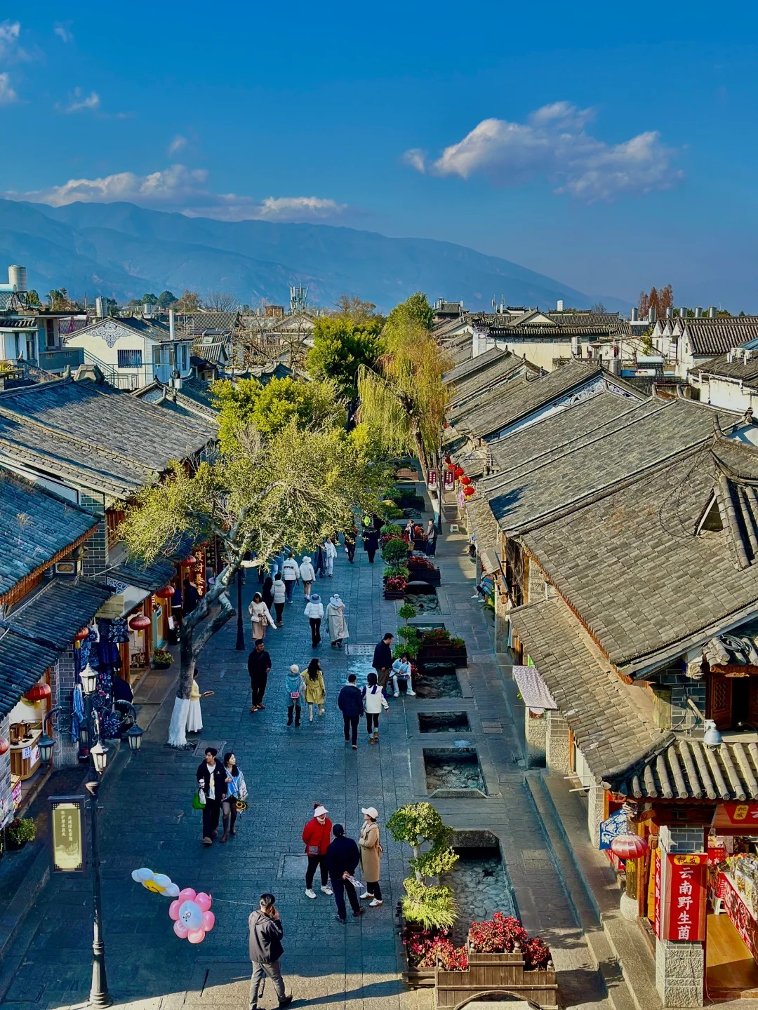 稍息片刻:前往大理古城city walk;大理古城“一水绕苍山,苍山抱古城”的城市格局。由南城门进城,一条直通北门的复兴路,成了繁华的街市,沿街店铺比肩而设。 街巷间一些老宅,也仍可寻昔日风貌,庭院里花木扶疏,鸟鸣声声,户外溪渠流水淙淙,“三家一眼井,一户几盆花”的景象依然。散落在古城角落的手作店、小吃摊、酒吧或者不起眼的小铺子,都是一处风景。