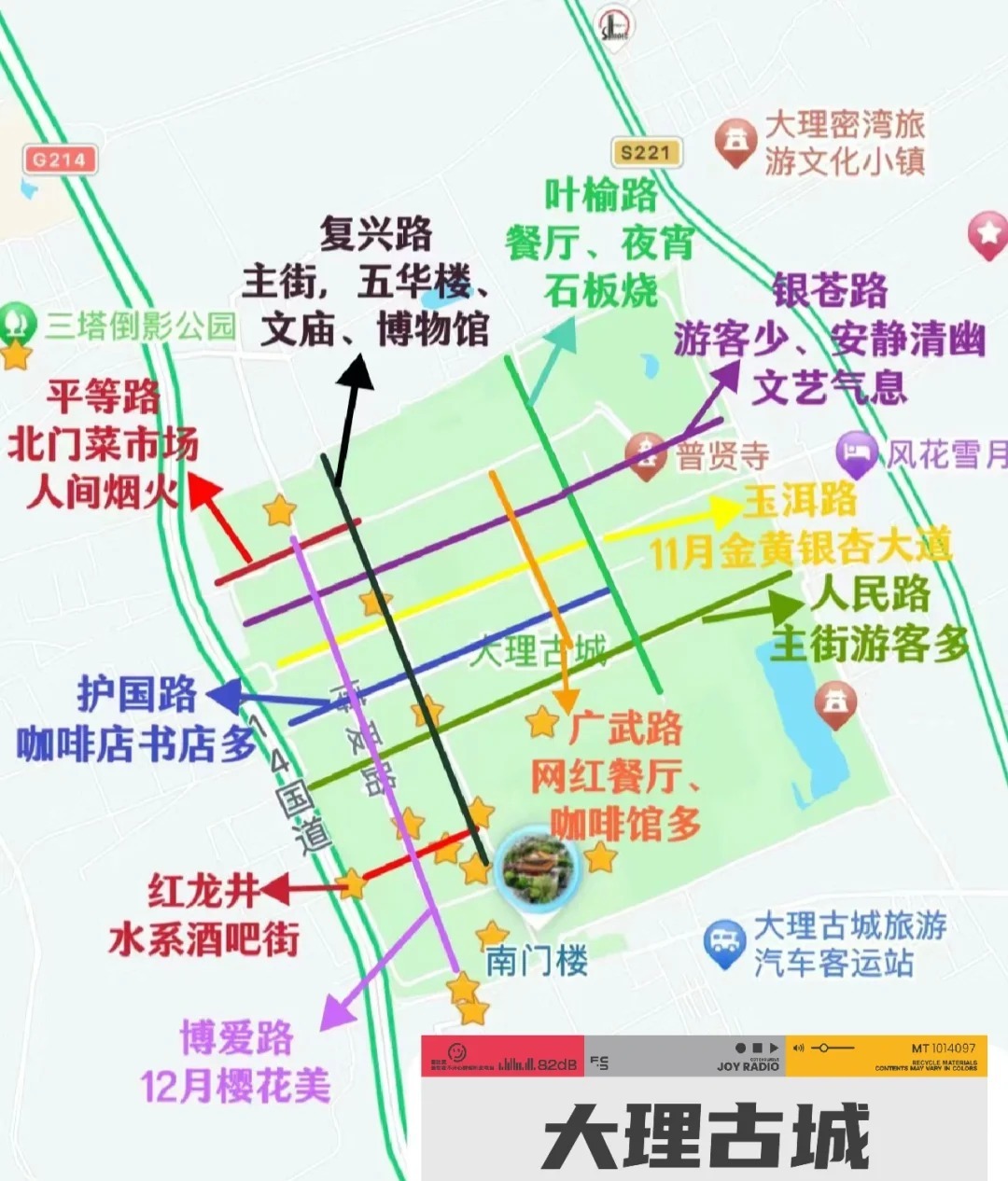 爱热闹版:古城南门→五华楼→红龙井(酒吧一条街)→博爱路(商业街)→人民路(摊位、小酒馆)→广武路(文艺网红店)→玉洱路→叶榆路→人民路→洱海门
