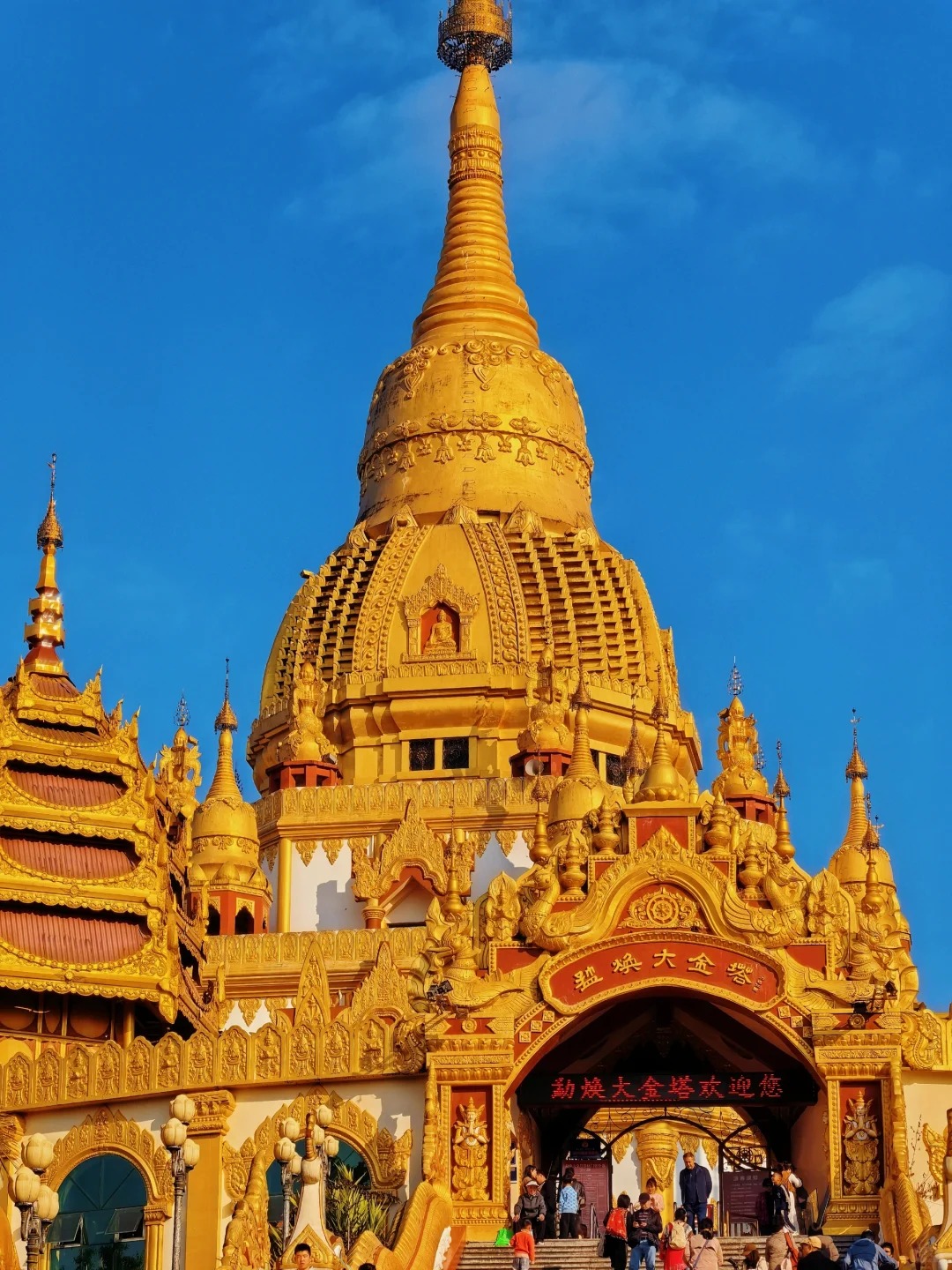 吃过午餐后前往芒市标志性景点【勐焕大金塔】(游览时间1小时左右)座落在云南省德宏州州府-芒市东南部孔雀湖畔的雷牙让山顶。青山绿水间的“勐焕大金塔”光彩夺目,金光灿灿,显得雄伟壮观,是芒市标志性的建筑,也是生活在这里的傣族人民的圣地;勐焕大金塔是中国第一金佛塔,亚洲第一空心佛塔。