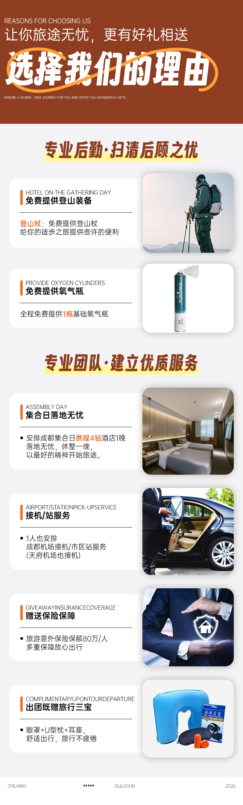 因四姑娘山(双桥沟景区)节假日期间景区门票有限流要求,为保障游客顺利游玩四姑娘山景区,所以如遇限流等问题,会安排长坪沟或海子沟游玩,不留遗憾。