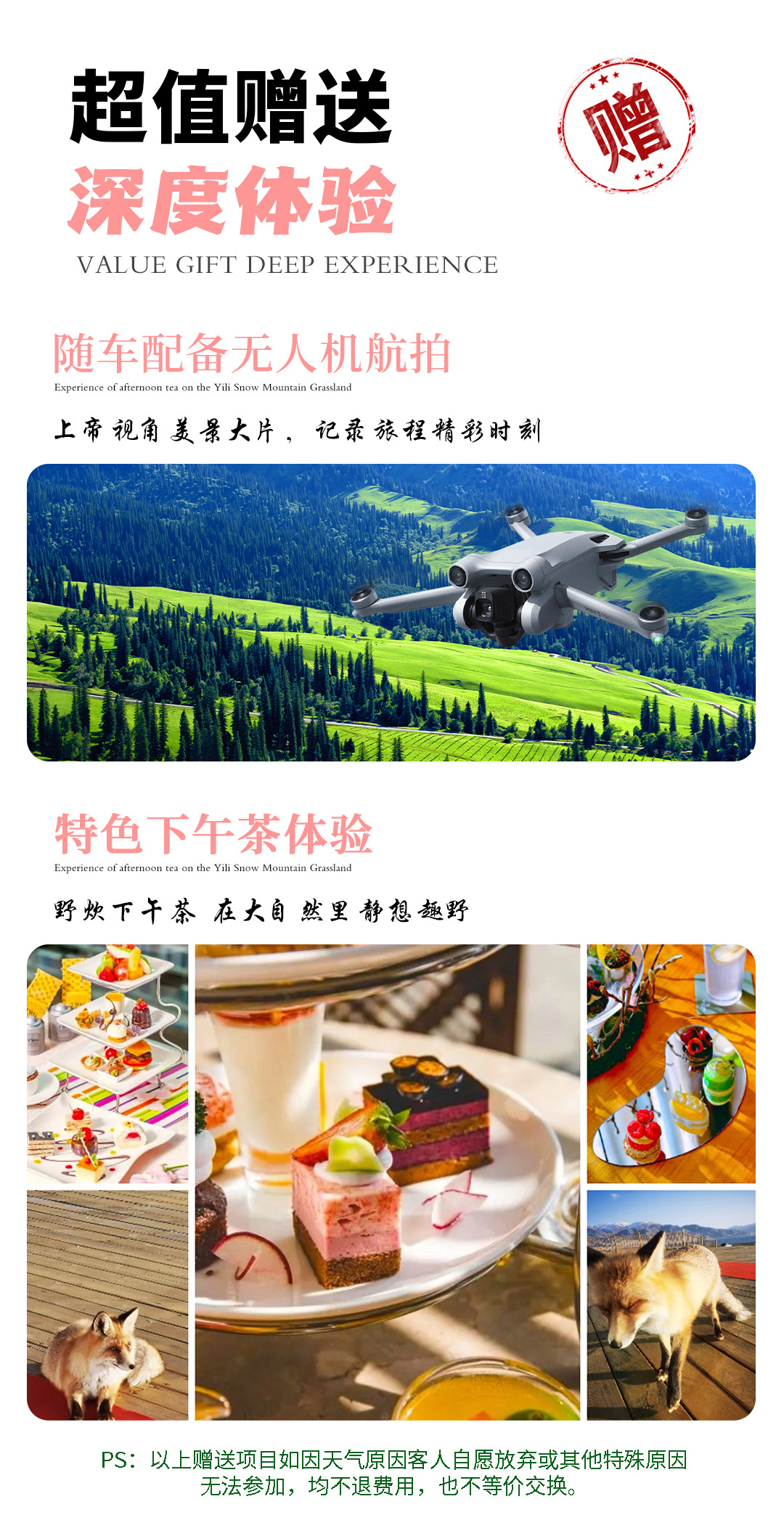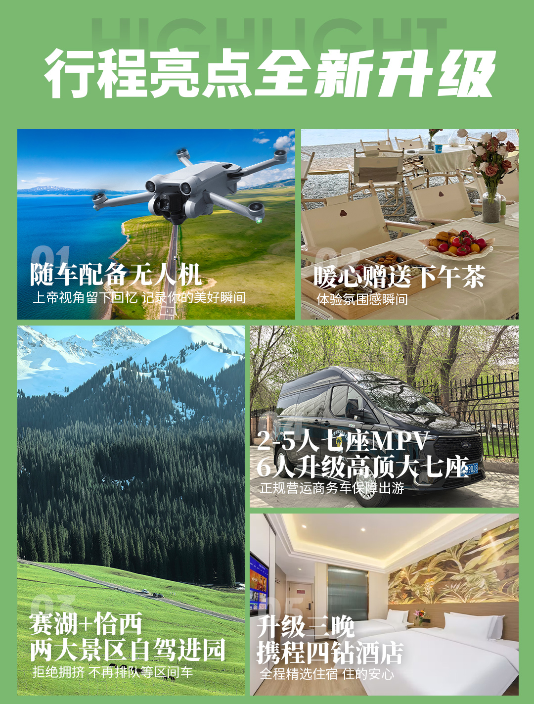 4. 随车配备无人机,司机师傅会选择1-2处景点给客人航拍(如遇雨雪大风等极端天气或当地特殊政策则无法航拍,请谅解。)