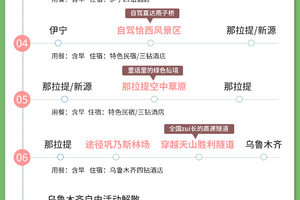早餐后从那拉提镇出发沿途穿行巩乃斯林场,雪岭云杉连片成林,草原野花点缀其间, 随手定格天山腹地的原始美景。一路攀升 ,翻越海拔3400 米的查汗努尔达坂,站在垭口可俯瞰蜿蜒山路,感受高山壮阔风光 (注意做好防风保暖)。穿越世界最长高速公路隧道【天山胜利隧道】,最后回到乌鲁木齐;