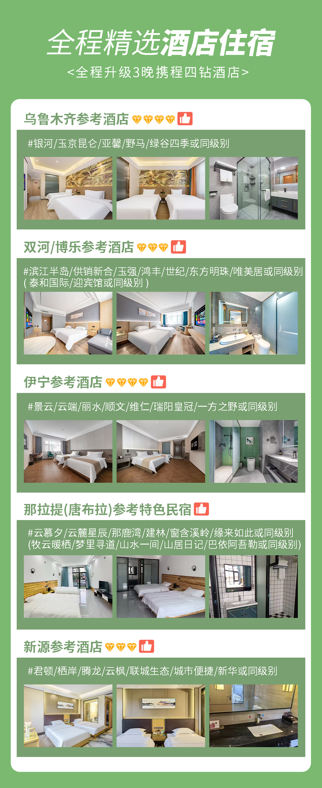 (因新疆经济相对落后,标准和设施与内地酒店存在落差,其以上酒店均为参考,不做指定,如遇以上酒店满房则安排同级别酒店,请大家悉知。)