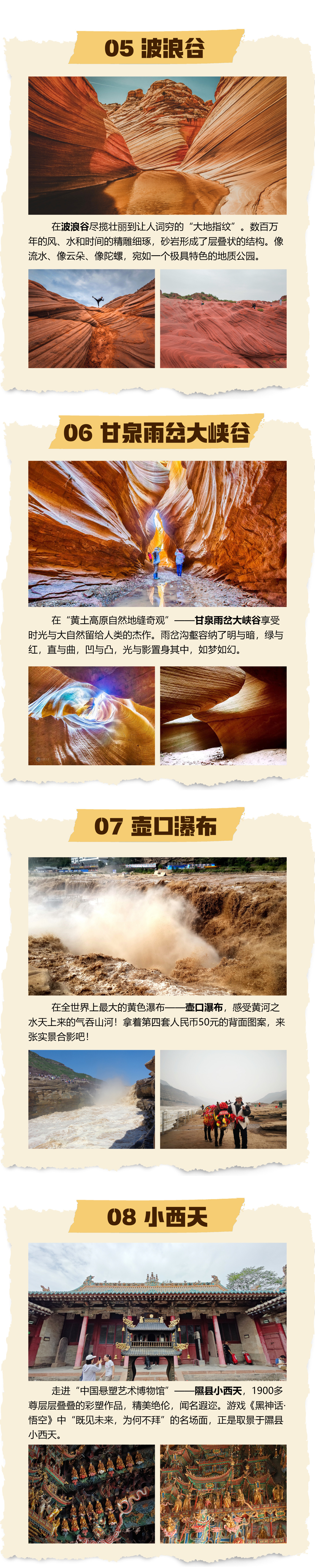 早餐后,乘车前往【壶口瀑布】,母亲河300米的河床在这里骤然被压缩到20—30米,黄河之水漫天而来,气势如山崩地裂。要切身感受它的壮观,非身临其境才行。壶口瀑布是第四套人民币50元的背面图案哦,赶快拿出准备好的纸币,打卡拍照吧!