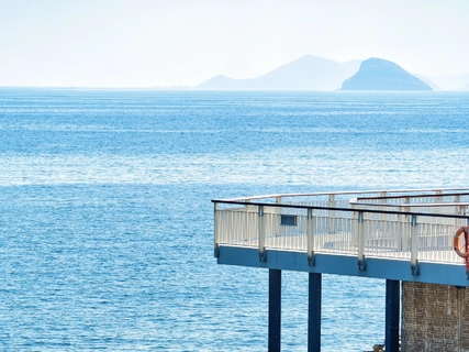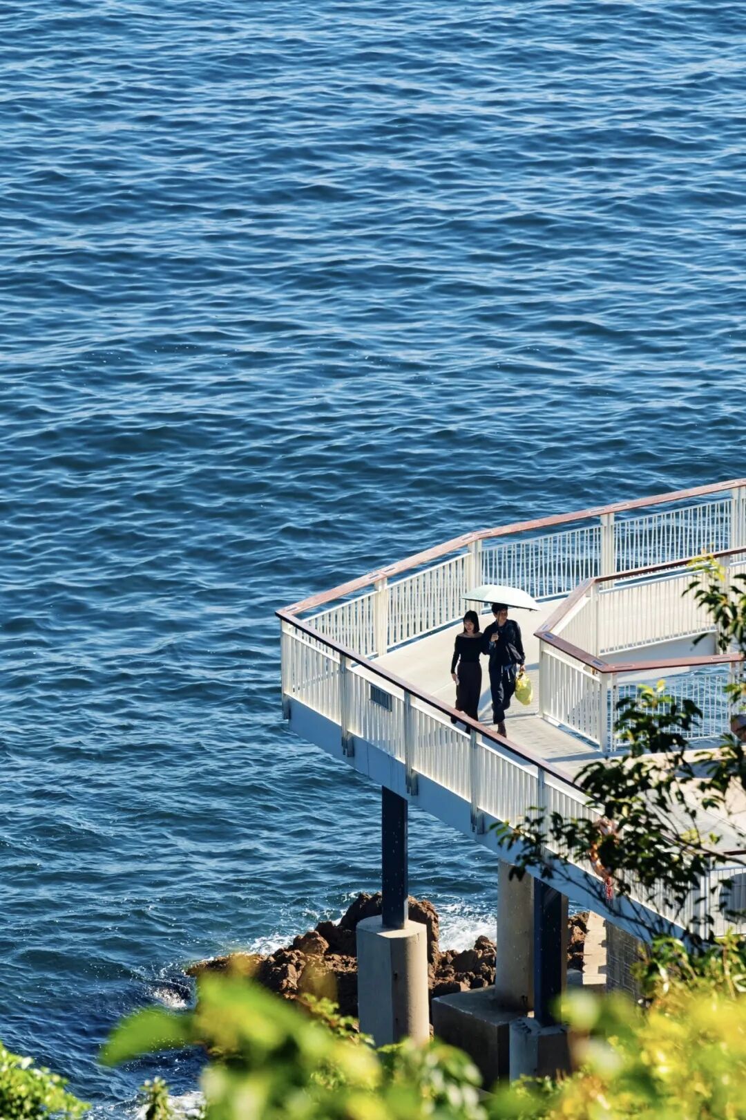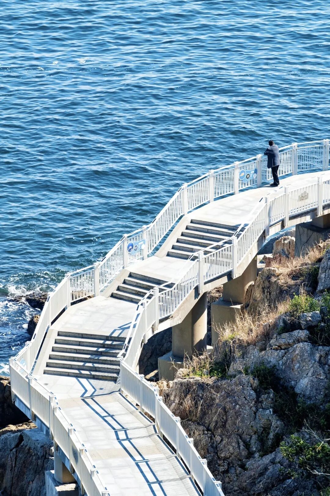 走在栈桥上,一望无际的海面波澜壮阔。栈道弯弯曲曲,蓝天白云,海蓝浪花,构成一幅美丽的景色。栈道漫步、骑行,面向大海,听惊涛拍岸,栈道旁边绿树成荫,海风拂面。