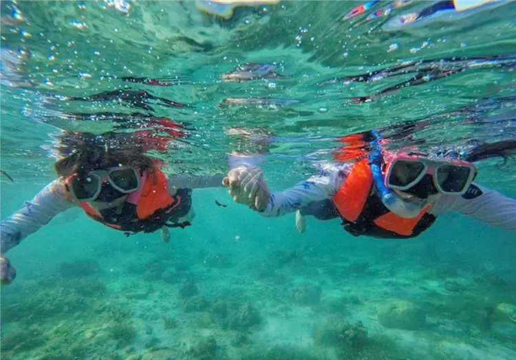 09:00 到达码头,整理行装,搭乘快艇出海。到达情人湾后,在我们的专属营地集合。听从领队安排以及项目讲解,分组分批次领取浮潜和桨板工具,全程穿着救生衣,自由约伴下海玩浮潜/桨板(如人多,每个项目需限时体验60分钟,如人少则不限时体验)