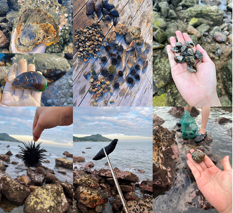 挖贝壳、捉螃蟹、捡海胆、海参,挖青口等