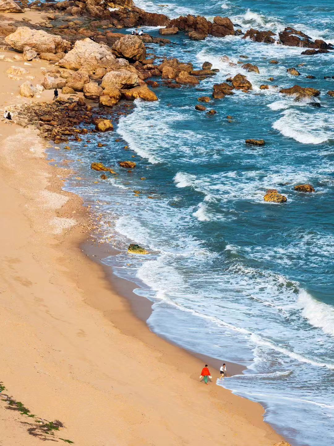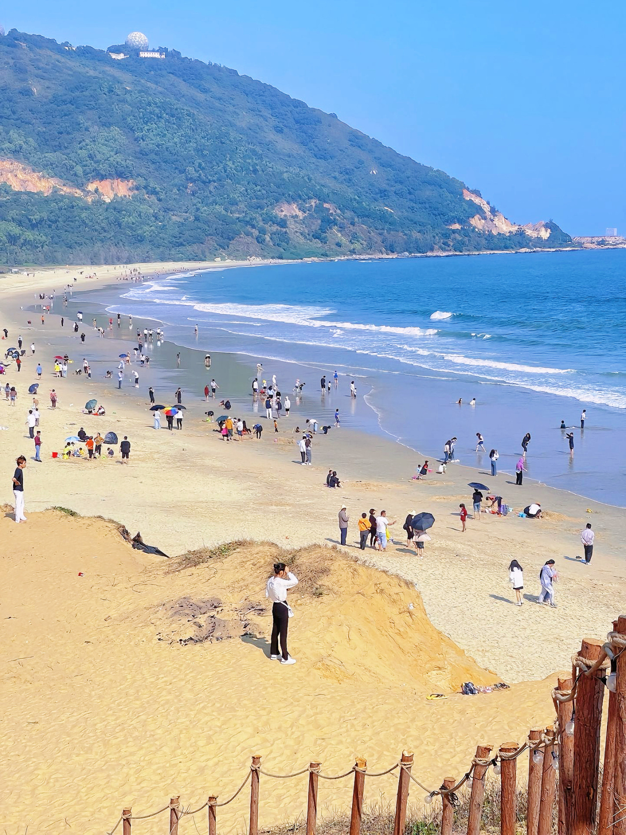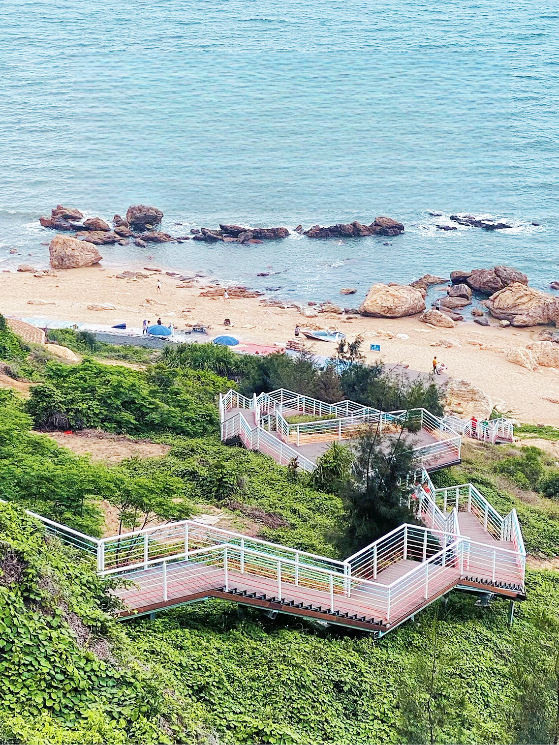 只用几分钟,缓缓登上这座葱郁的小山。在观景平台上,你将获得一个“上帝视角”:眼前是第一滩延绵数里的银色沙滩与蔚蓝大海,山海相依的壮阔画卷在此完整展开。